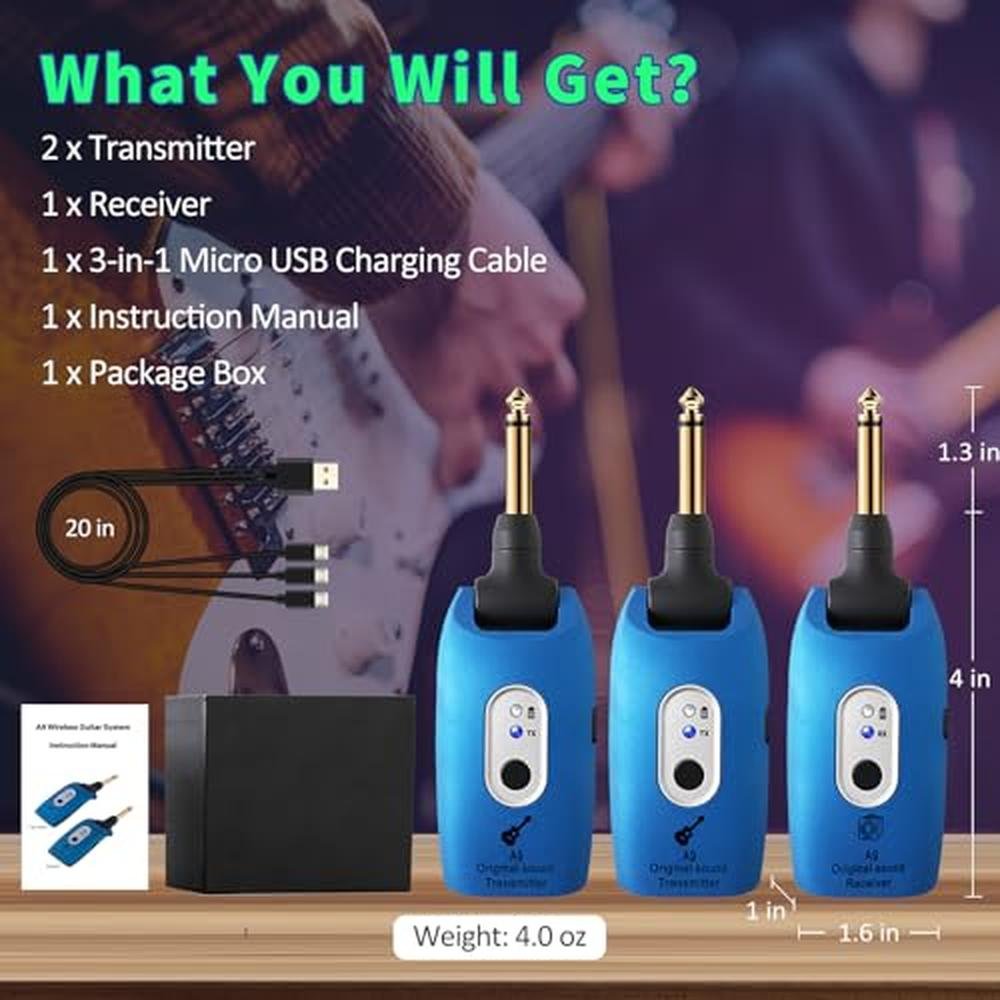 Double-Ended USB Cable: -The 2-Way USB Cable Can Charge The Transmitter And Receiver Simultaneously, More Convenient And Save Of Time. -It Can Be Used More Than 5H After 1.5H Fully Charged. Free Yourself From The Concern Of Low Battery In A Long Show. 100 Feet Transmission Distance: -Achieving 100 Feet Long Wireless Transmission Range, High Sampling Rate Makes The Sound Output More Representative. Easy To Use: -Turn It On, The Transmitter And Receiver Will Match Automatically. No Extra Operation Is Required. Long Press The Signal Light To Change The Channel. -The System Divides The Working Frequency Into 4 Channels So As To Avoid Mutual Interference. Each Pair Occupies A Channel While In Use. 270 Rotatable Design: -Arbitrary Rotation, No Need To Worry About Its Protruding Affects Performance. Each Angle Gives You A Sense That It Attaches To The Instrument. Device-Compatible & Wildly Used: -For Transmitter, It Can Be Applied To Most Kinds Of Electric Musical Instruments, Like Electric Guitars, Bass, Electric Violins, Keyboards, Etc. -For Receiver, It Can Be Used In Amplifier, Mixer, Guitar Effect Pedals, Guitar Loopers, Etc. -Strong Campatibility Satisfies Your Demand To The Maximum Extent. Multiple Occasions: -This Wireless Guitar Transmitter Receiver Is Suitable For Many Occasions, You Can Use It In Small Performances, Or Individual Performance Or Practice Alone Or Family Party, Also You Can Walk Freely On The Stage No More Than 100 Feet. You Will Get: -1 * Transmitter -1 * Receiver -1 * 2-Way USB Cable Note: -The Musical Instruments Showed In The Pictures Are Not Included. -If You Meet Any Problems, Please Contact Us, We Will Solve It As Soon As Possible To Ensure 100% Customer Satisfaction Experien