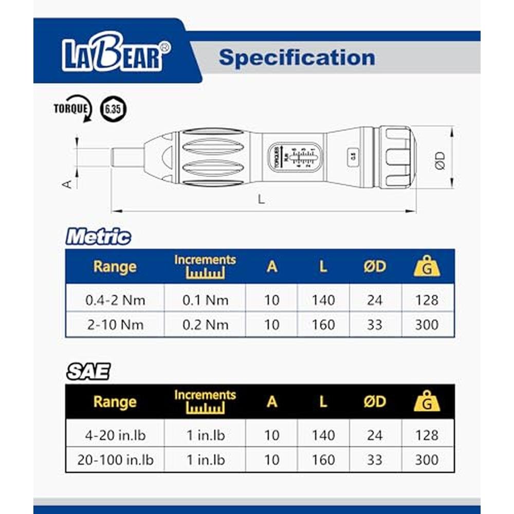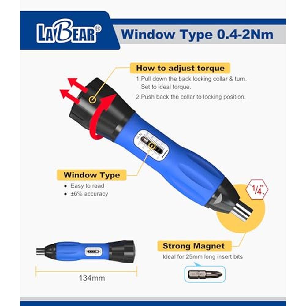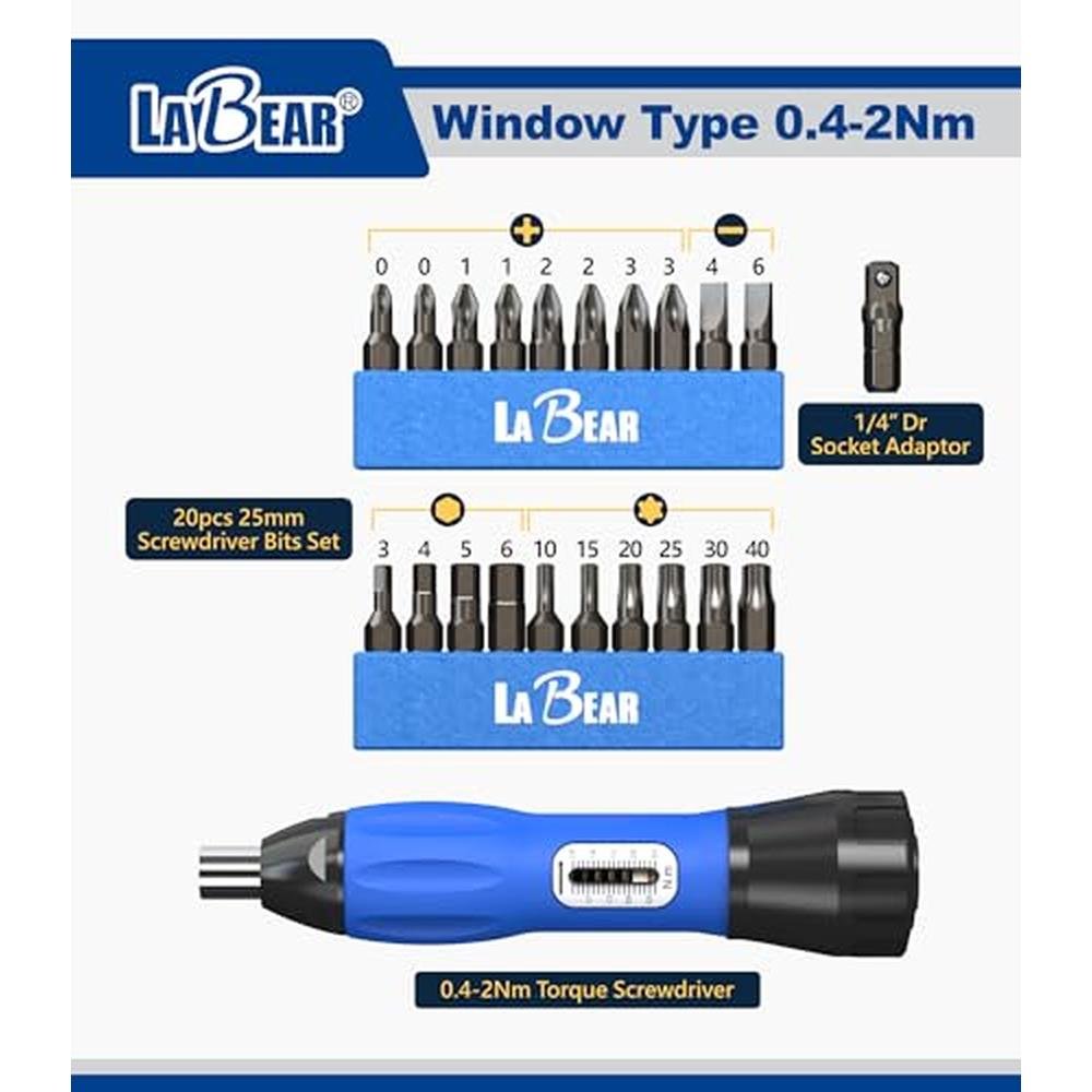 LABEAR- 22pcs 1/4" DR.0.4-2Nm Torque Screwdriver Wrench Driver Bits Set for Maintenance,Tools, Bike Repairing and Mounting.