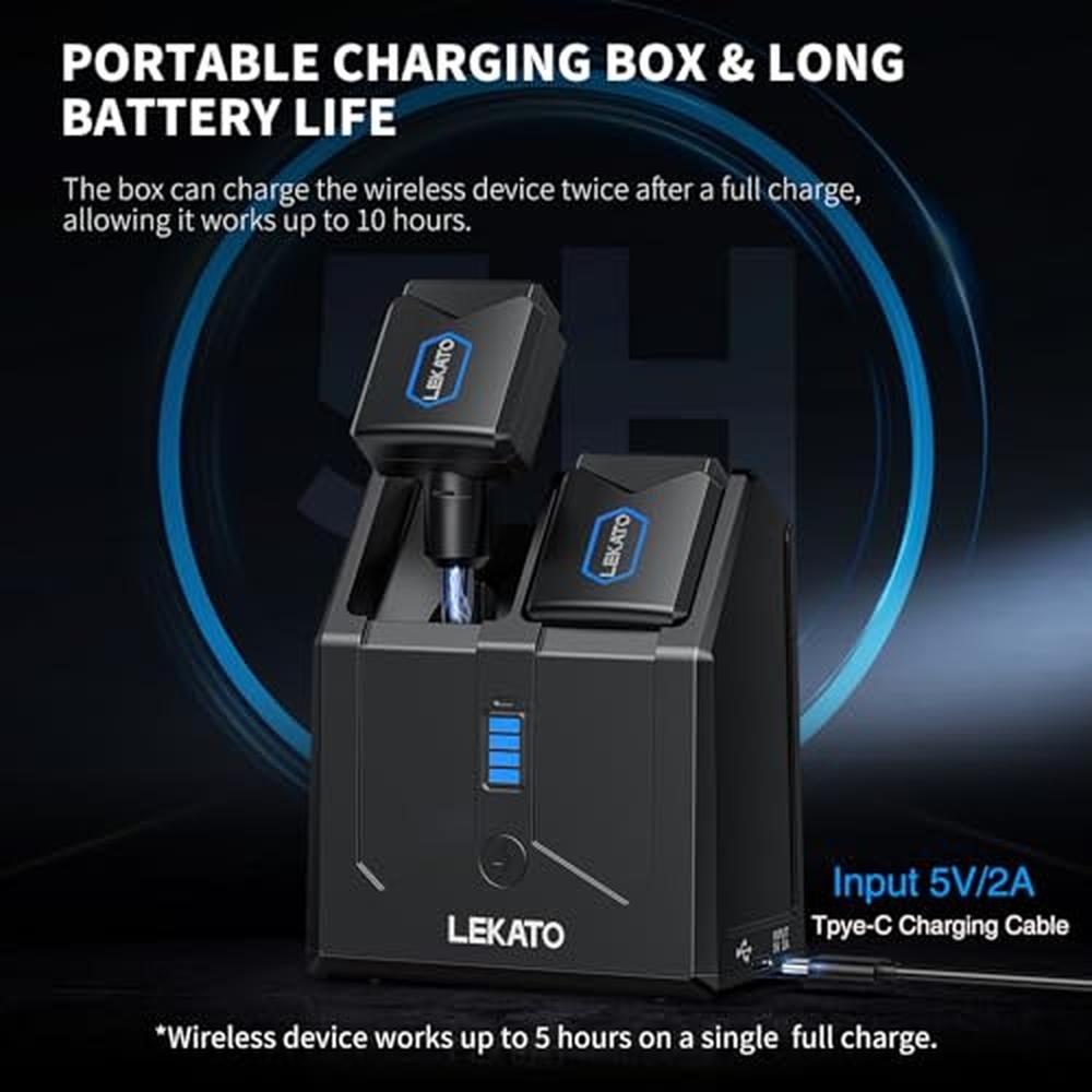 LEKATO JW-06 Wireless Guitar System with Charging Box 5.8GHz Audio Wireless Transmitter Receiver Wireless Guitar Transmitter and Receiver Rechargeable Wireless Audio System for Electric Guitar Bass Parameters: Frequency band:2.4Ghz ISM frequency band 48k/16bit audio resolution Delay time: 6ms Transmission distance:> 20m Frequency response:10Hz-22KHz+-1dB Channel banks quantity: 4 Channel banks Specifications: Battery: Rechargeable lithium battery 3.7V/500mAh Charging box capacity: 5000mAh(Charge the wireless devices more than twice) The long battery life allows you to focus on your performance without worrying about running out of battery. Box dimensions:84*100*46mm Charging box output and input voltage: 5V,2A