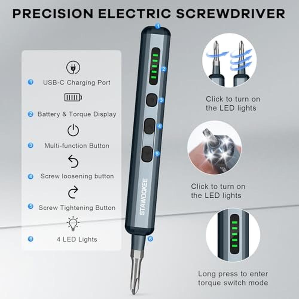 - Lightweight & ErgonomicThis electronic screwdriver set features a compact design with an integrated LED light, mini drills and an ergonomic grip for comfortable use. It's also very portable, making it perfect for any work environment