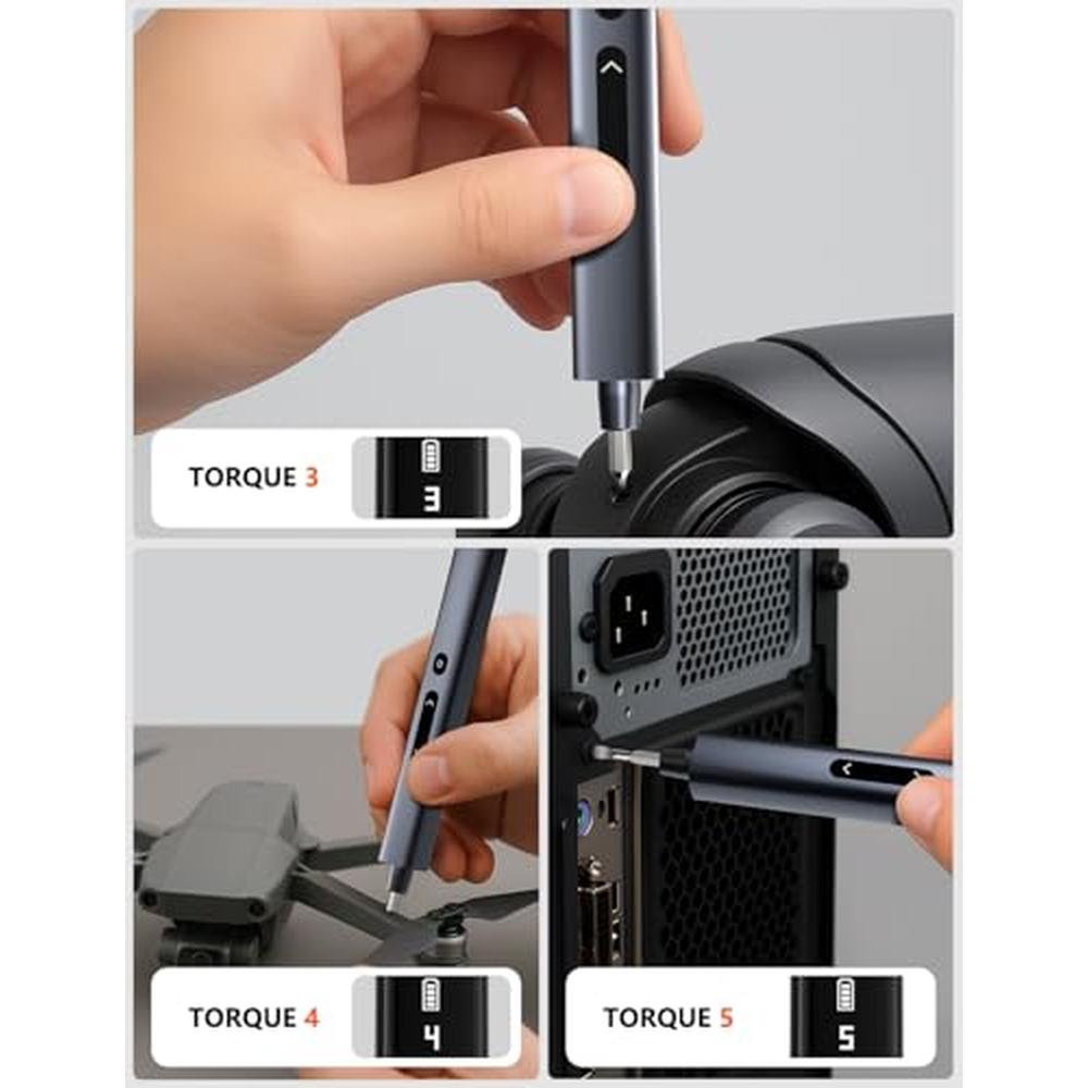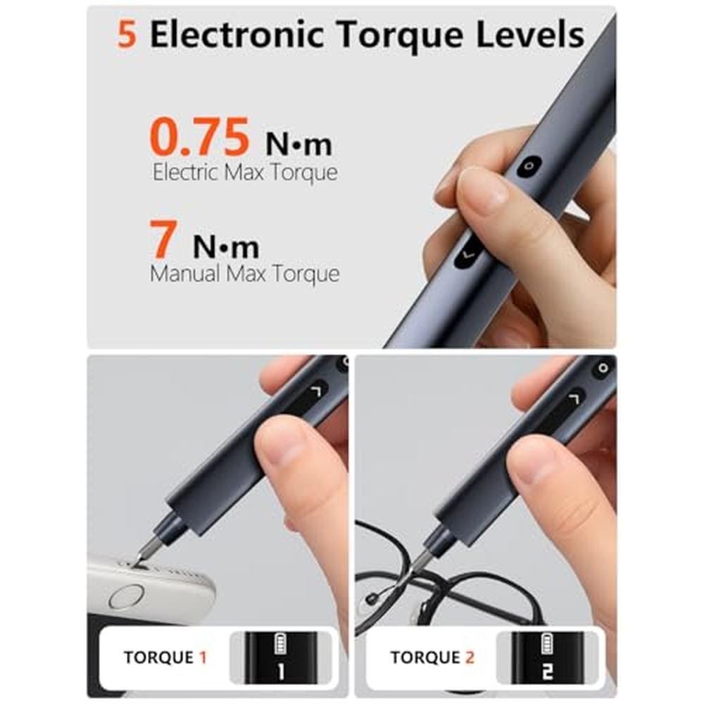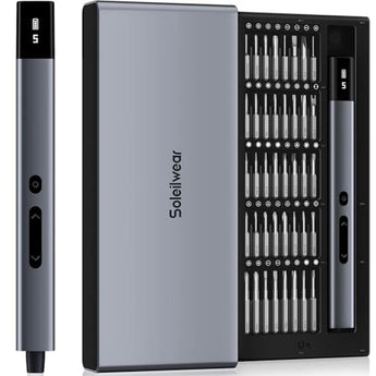 - Latest 5 Torque Upgrade & More Powerful The Soleilwear mini electric screwdriver features 5 adjustable torque levels** (0.15-0.75N.m), giving you precise control to handle various tasks. The manual torque of 7N.m provides extra power for manual screwdriving when needed.Designed for stability and ease of use, this electric screwdriver cordless is perfect for laptops, smartphones, MacBooks, toys, drones, keyboards, glasses, watches, and most other electronic devices. Save time and effort with a tool built for convenience and efficiency.