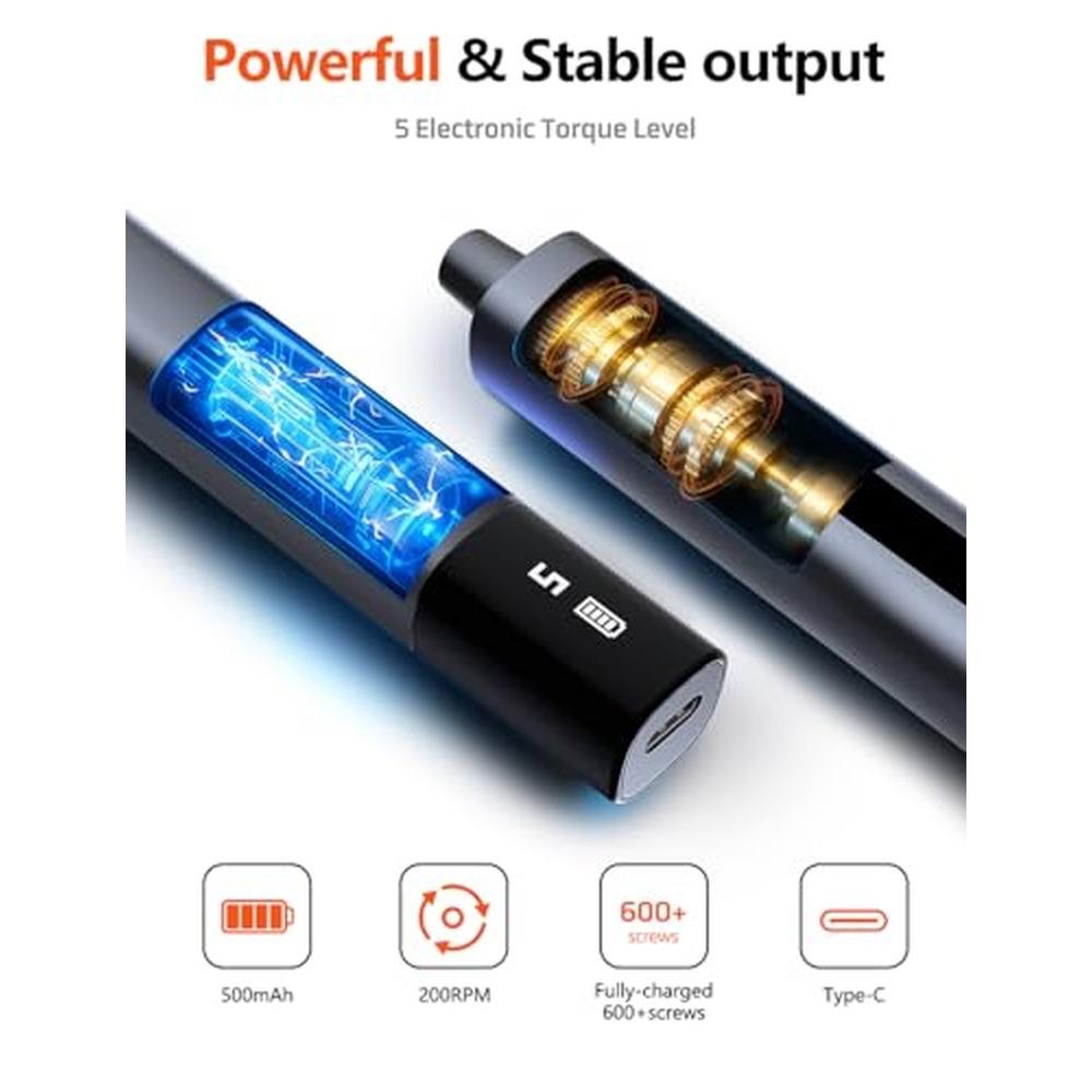 - Rechargeable & Long-Lasting Battery Powered by a high-capacity 500mAh rechargeable battery, this screwdriver set can handle over 600 screws on a single charge. With a robust 200 RPM motor, even tough jobs become effortless. The USB-C charging cable ensures quick and easy recharging, so you're always ready for your next project.
