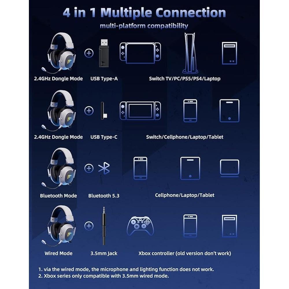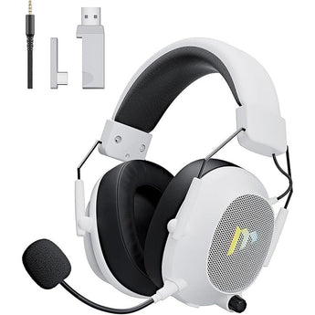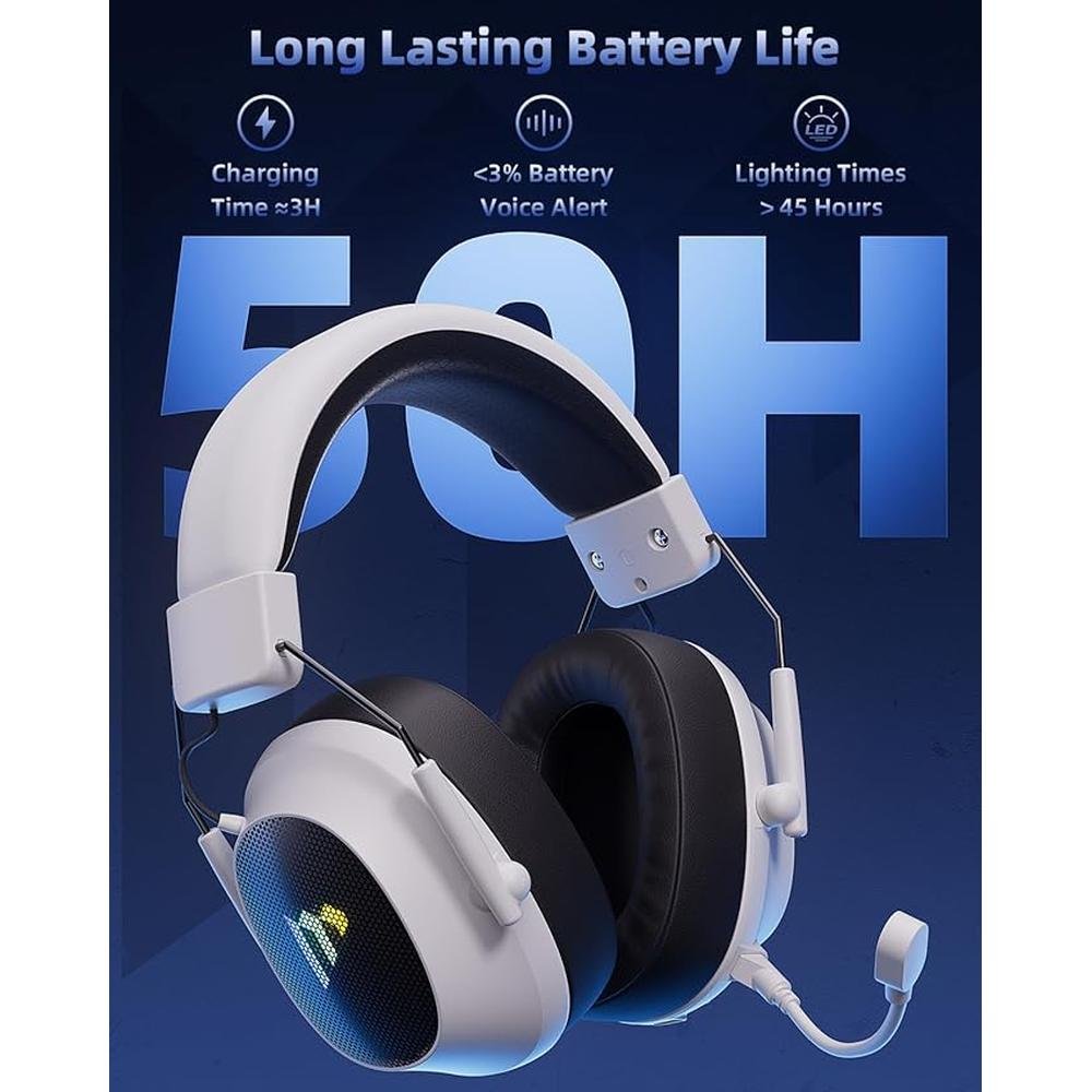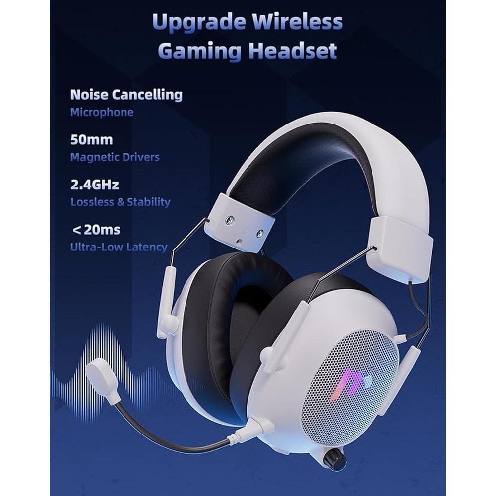 Mytrix Tac Master 2.4GHz Wireless Gaming Headset with Noise Canceling Microphone for PC, PS4, PS5, Mac, Bluetooth 5.3 Gaming Headphones with RGB Light, Surround Sound, 50H Battery (White)