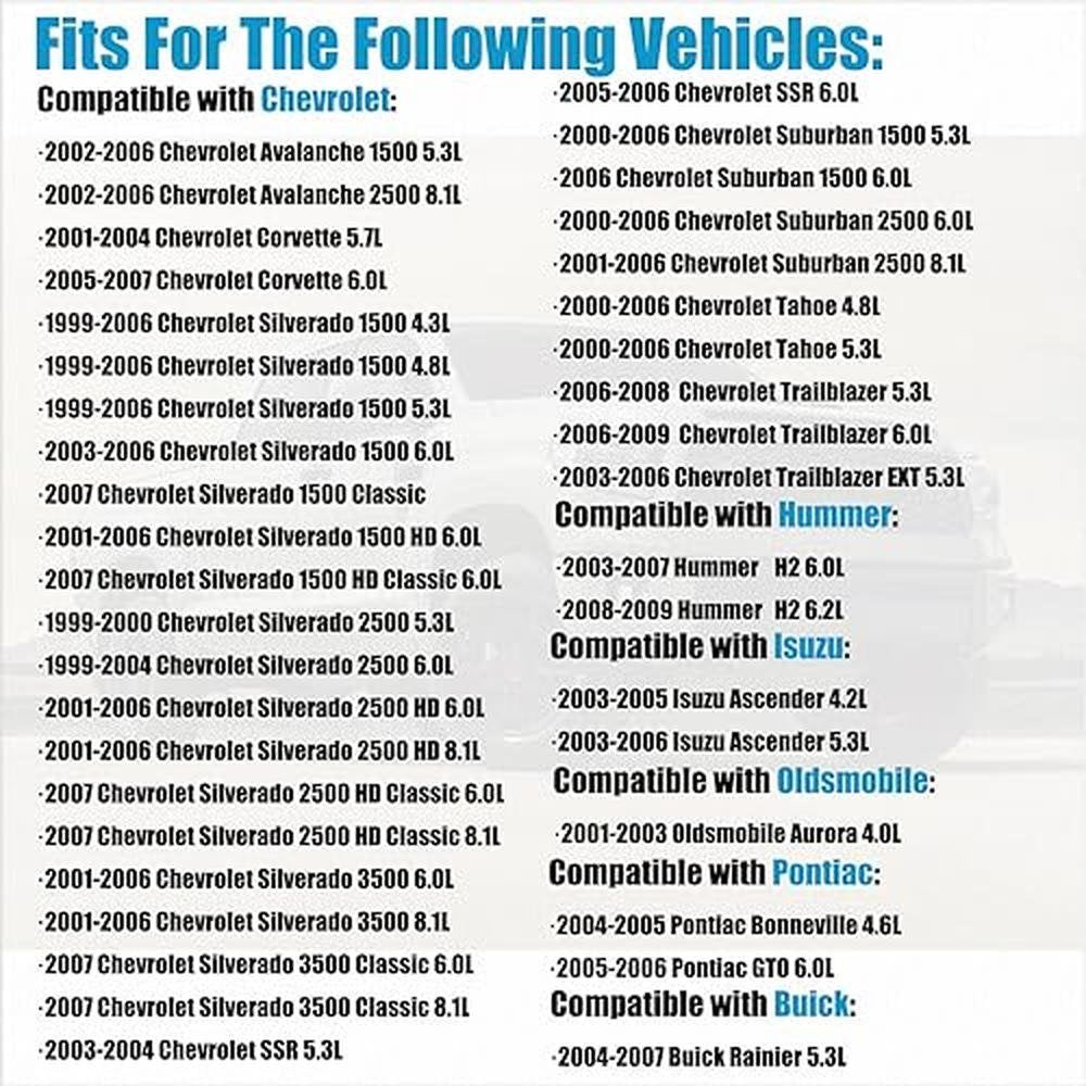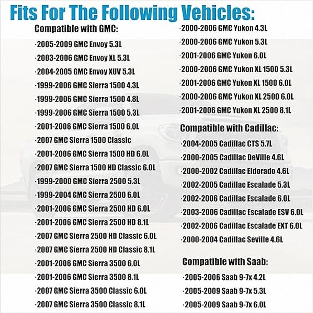 • Fitment For Other For Cadillac 2004 2005 CTS V8 5.7L, 2000-2005 DeVille V8 4.6L, 2000-2002 Eldorado V8 4.6L, 2002-2006 Escalade Escalade ESV Escalade EXT V8 5.3L 6.0L, 2000-2004 Seville V8 4.6L For Hummer V8 6.0L 2003-2007 2008-2009 V8 6.2L For Buick 2004-2007 Rainier V8 5.3L For Isuzu 2003-2006 Ascender L6 4.2L V8 5.3L, 2007 2008 2012 NPR, 2007 2008 NPR-HD V8 6.0L For Saab 9-7x 2005 2006 4.2i L6 4.2L, 2005-2009 5.3i V8 5.3L, 2008 2009 Aero V8 6.0L For Pontiac 2004-2005 Bonneville V8 4.6L, 2005-2006 GTO V8 6.0L For Oldsmobile 2001-2003 Aurora V8 4.0L