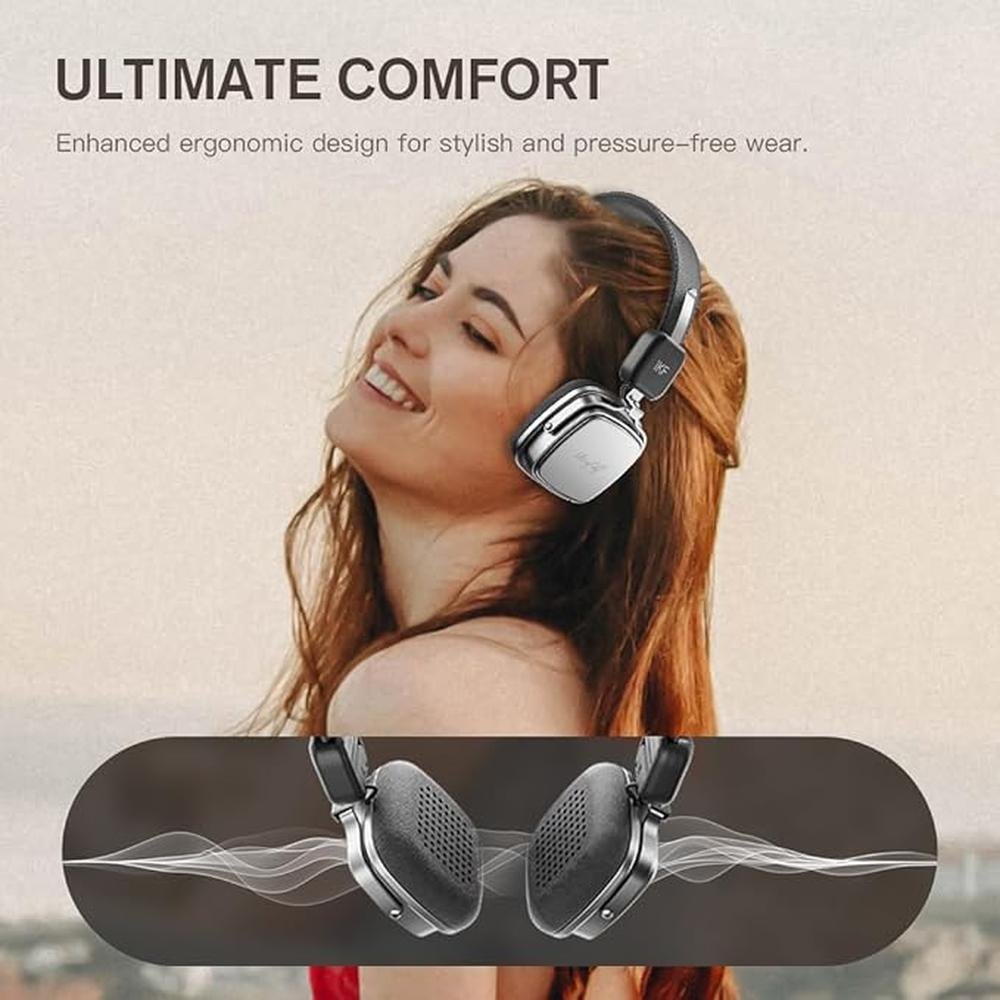 - Indulge in the comfort and style of our metal and leather grain design, complete with ergonomic ear cushions and a durable headband, perfect for extended listening sessions.