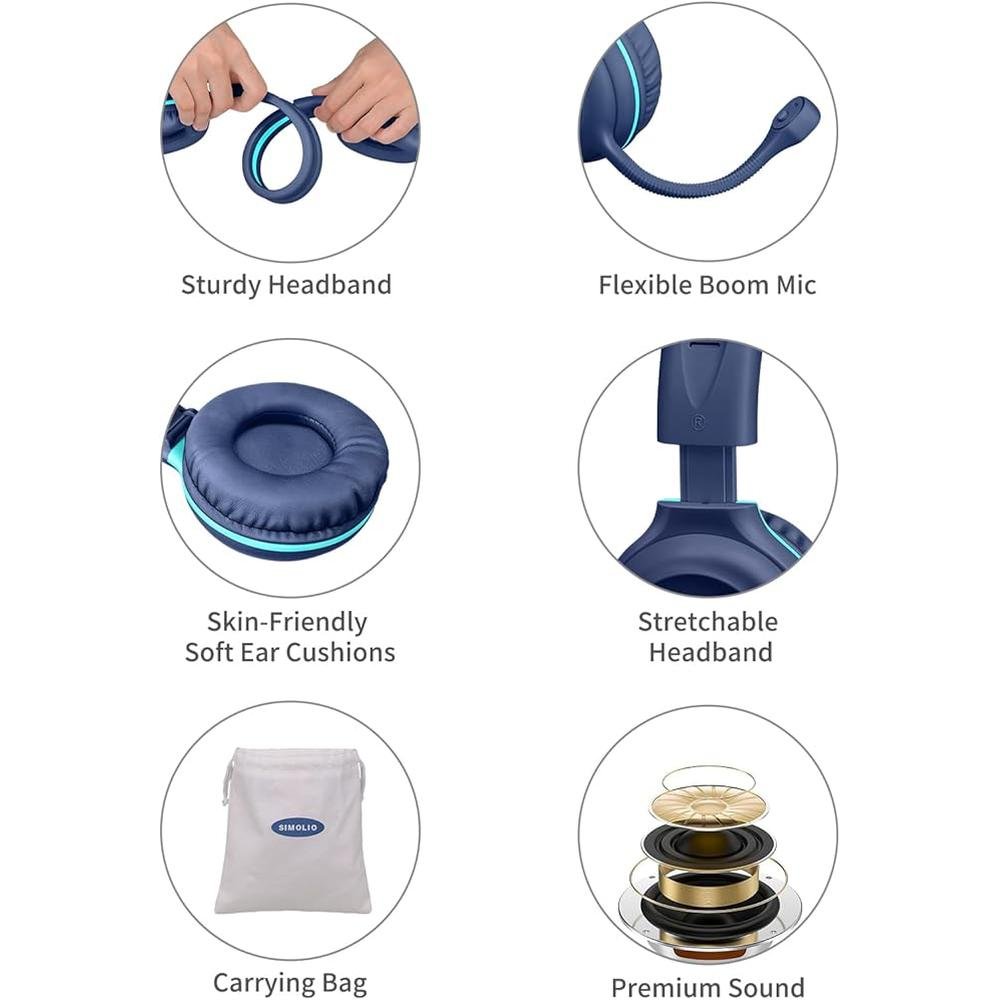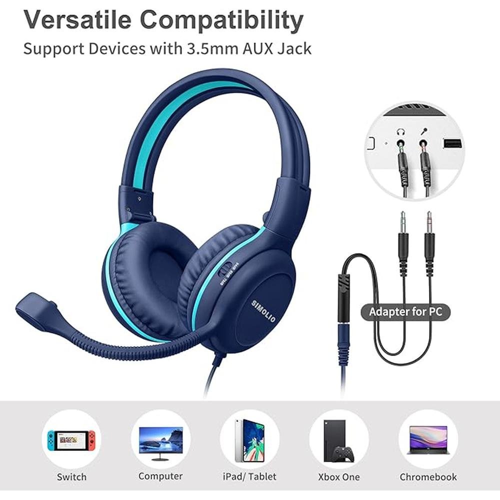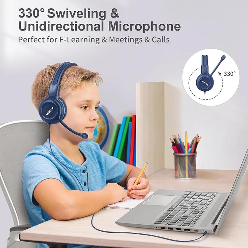 SIMOLIO Wired Headphones for School with Microphone, Stereo Kids Headphone with Flexible Swivel Boom Mic for Student K12 & Teacher & E-Learning, 3 Levels Volume Limiter Gaming Headsets for Boys, Girls