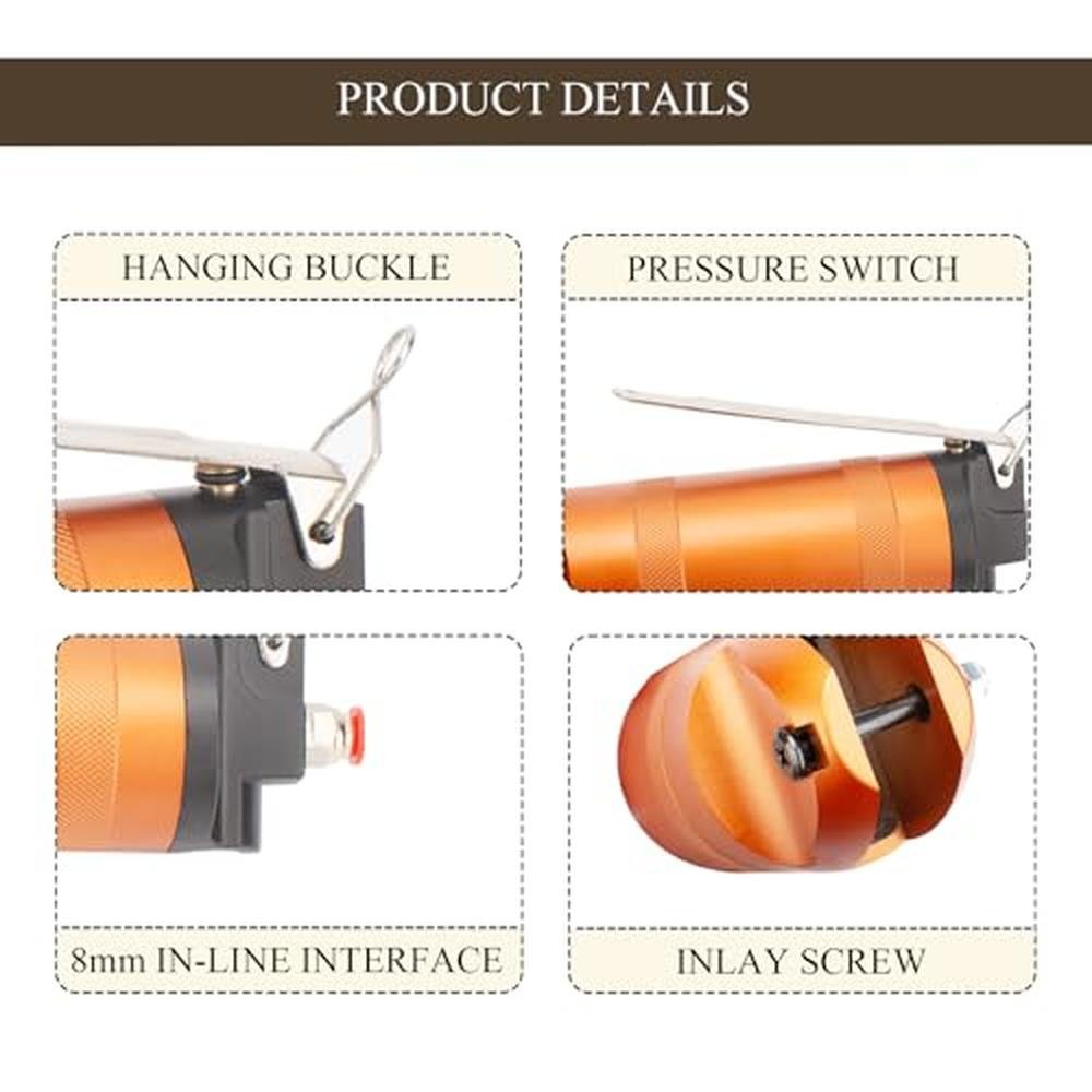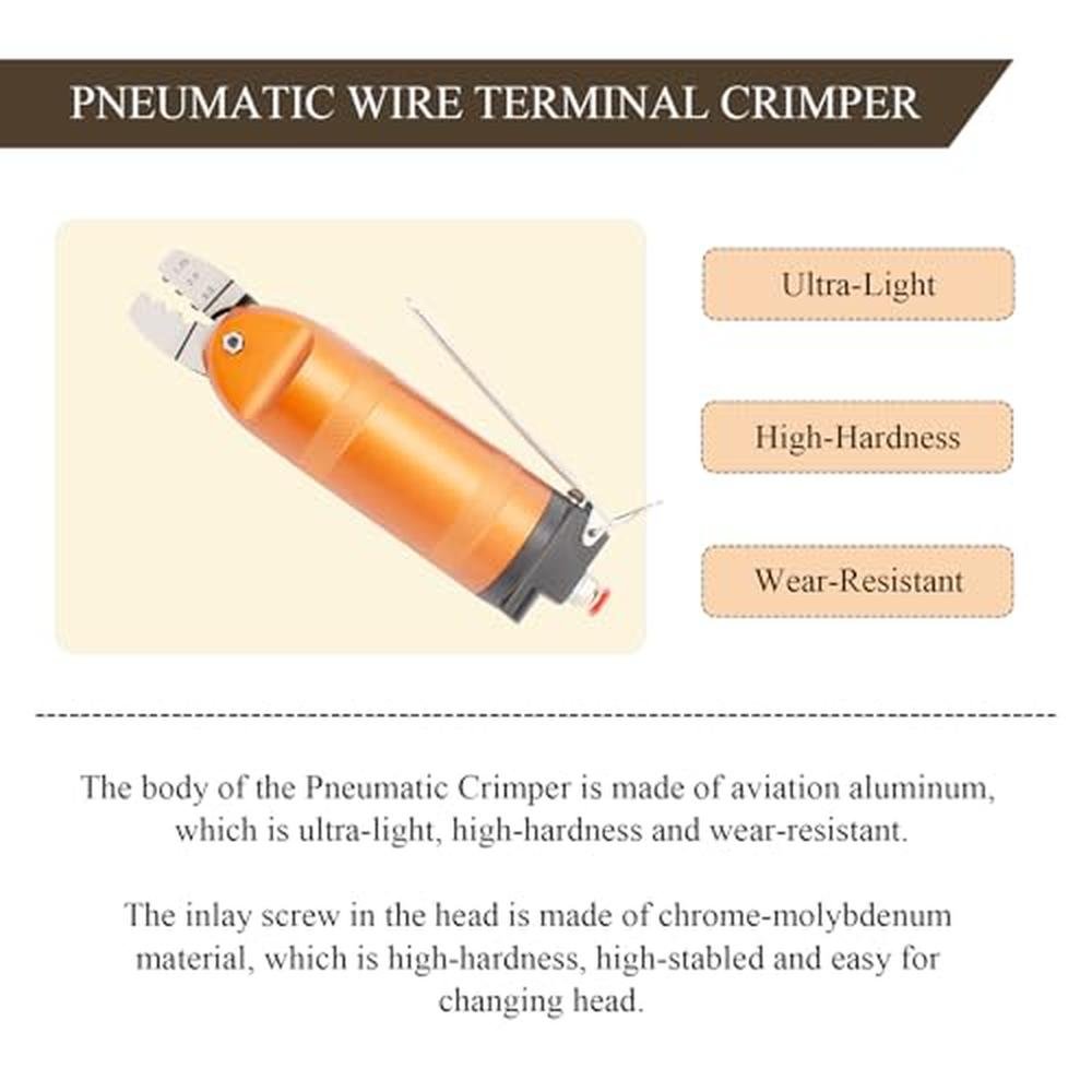 - SUPERIOR MATERIALThe body of the Pneumatic Crimper is made of aviation aluminum, which is ultra-light, high-hardness and wear-resistant. The inlay screw in the head is made of chrome-molybdenum material, which is high-hardness, high-stabled and easy for changing head.