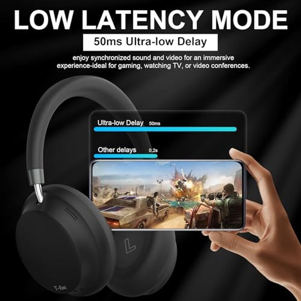 T-fun NC45 Active Noise Cancelling Headphones: Reduce up to 28dB of noise, which can effectively minimize unwanted ambient sounds in noisy environments. Built-in 40mm dynamic driver which can handle audio signals more effectively and minimize distortion, NC45 over ear noise cancelling headphones deliver clear highs and deep bass for an immersive listening experience. Designed with ultra-soft memory foam protein ear cushions and an adjustable headband, ensures long-lasting comfort, with easy button controls on the right ear cup to easily manage volume, power, answer calls, and change modes. The matte finish adds a stylish touch, making them look sleek and modern. Bluetooth 5.3 ensures faster pairing, more stable connection, low-latency listening experience, and better audio output. Multipoint connectivity allows you to connect to two Bluetooth devices at once, so you can easily switch between calls and music without missing a moment. An intuitive T-fun app for EQ customization to tailor personal preferences. Built in 700mAh battery that offers up to 55 hours of playtime in wireless mode(60% volume, ANC on) & unlimited listening in wired mode. ANC mode, low-latency mode, or normal mode are optional, switch to different modes based on your environment to enhance the overall listening experience. Specification Speaker unit: 40mm Sensitivity: 105+/- 3db Bluetooth Version: V5.3 Impedance: 32 +/-15% Frequency range:20-20KHz Active Noise Cancellation: 22-28dB Playtime: 55 Hours (60% Volume/ANC on) Bluetooth Operation Distance: 10-15m Built-in Rechargeable Battery: 3.7V/700mAh Over Voltage Charging Protection Packing list: NC45 Active Noise Cancelling Headphones Type A to C Charging Cable 3.5mm Audio Cable