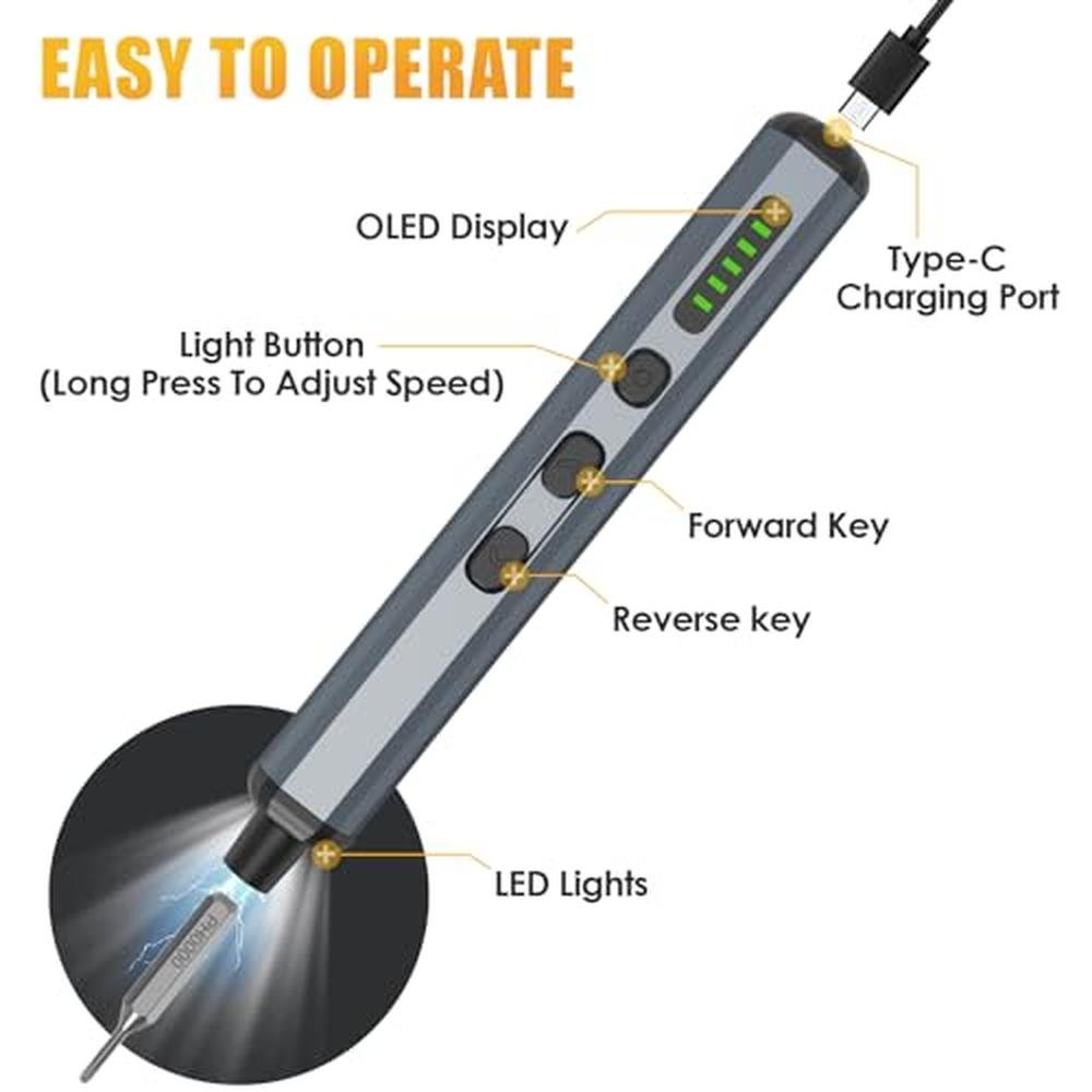 - Elevate Your Repairs with the Mini Electric Screwdriver Kit: Our rechargeable electric screwdriver boasts a powerful 350mAh lithium-ion battery, offering 3 hours of continuous use with a 90-day standby time. The built-in OLED display indicates work status, gear selection, and battery level. With a speed of 200 RPM, it's perfect for precise and efficient electronic repairs. Plus, two shadowless LED lights help you locate screws in low-light conditions.