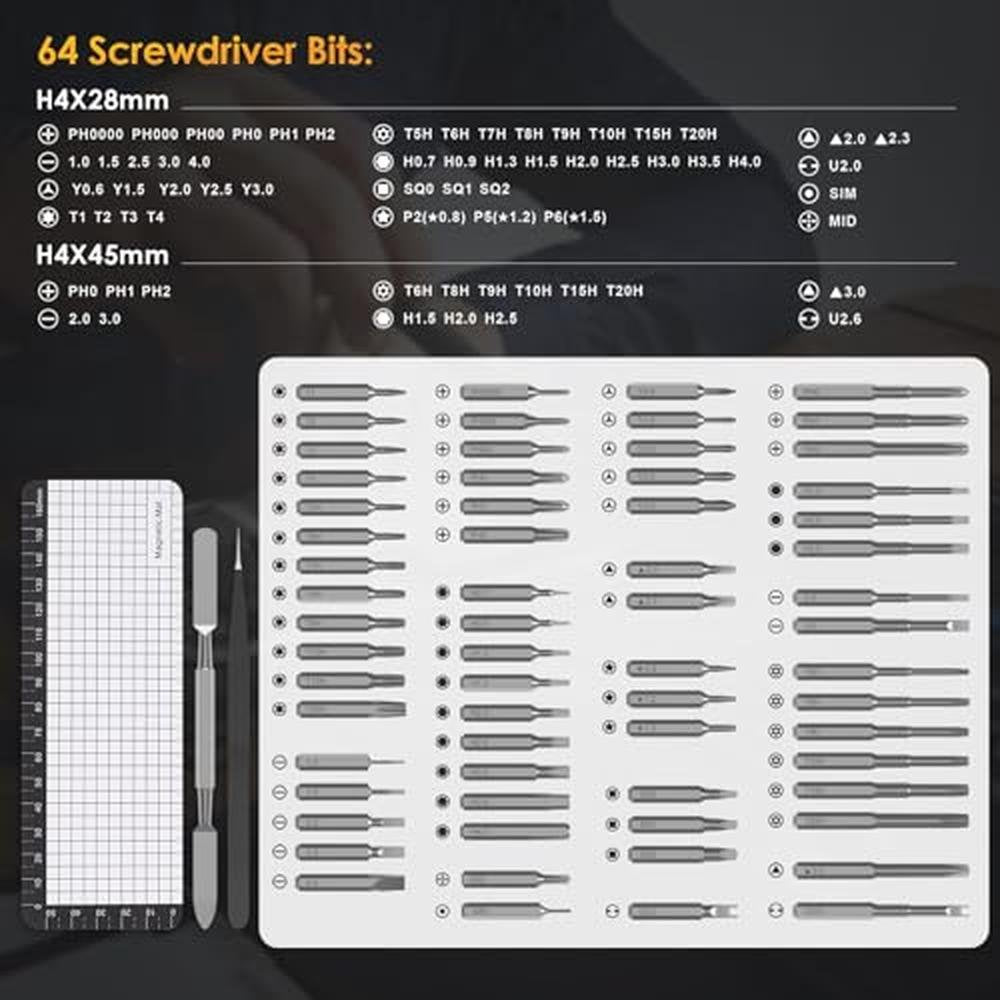 - Precision Electric Screwdriver Kit with 68 Bits: Elevate your screwdriving game with our precision electric screwdriver kit, complete with 68 S2 steel drill bits boasting a 60 HRC hardness rating. S2 steel ensures superior strength, durability, and corrosion resistance compared to CR-V. Each drill bit undergoes high-precision machining to safeguard screws from damage. Perfect for precision tasks, this kit includes 1 electric screwdriver handle, tweezers, a pry bar, a magnetic suction piece, and
