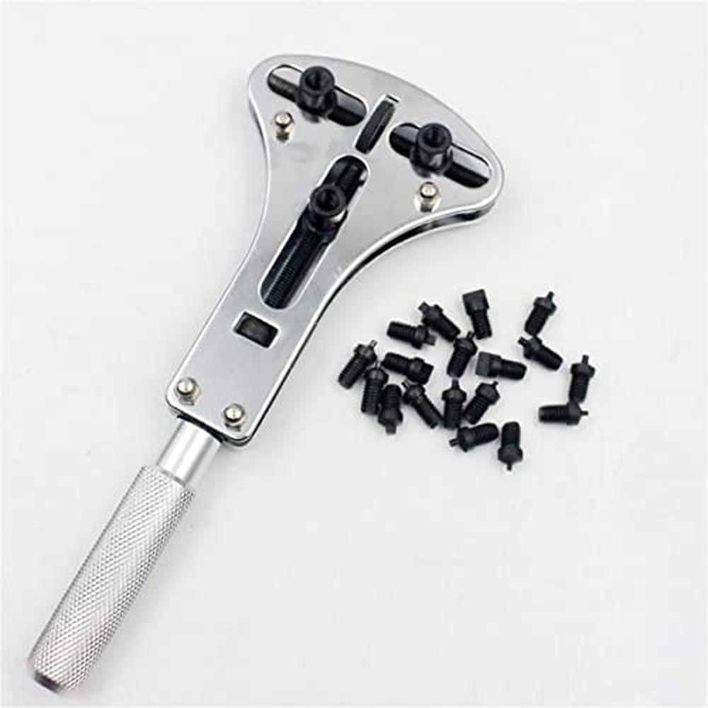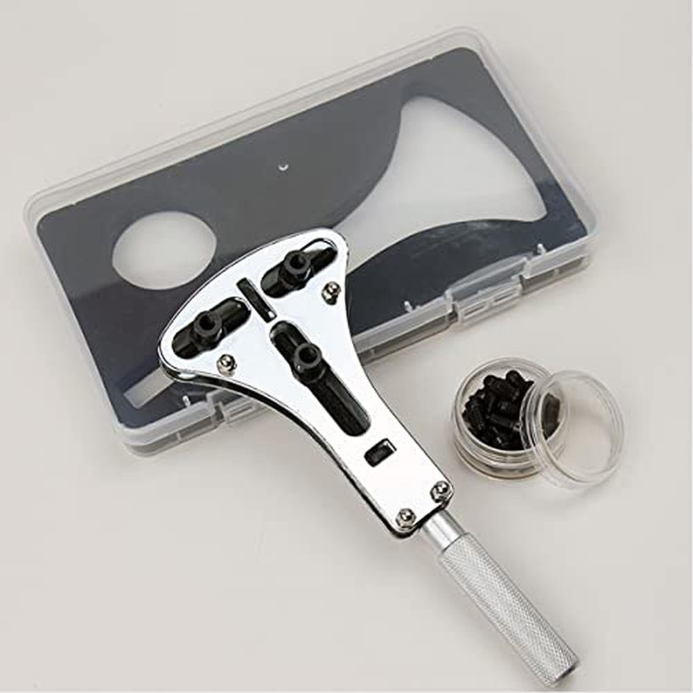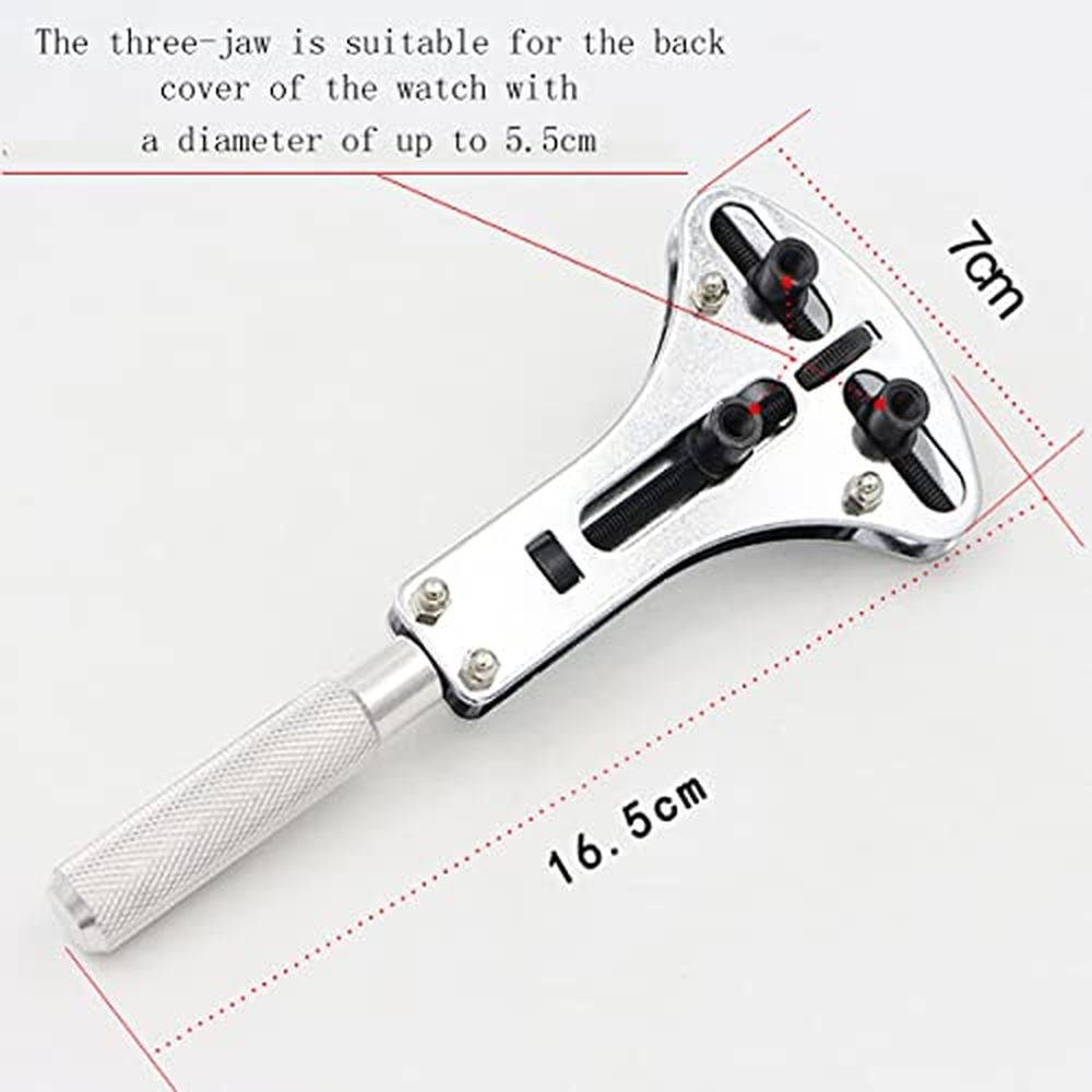 watch wrench,watch back opener, Watch repair tool, Watch back removal tool, 3 Point wrench screw case remover tool, Adjustable watch back case opener. Specification : watch back remover tool: 1 Pack Key for waterproof watch-cases,with 6 sets of clamps Workable Size:within 18mm - 55mm Watch Screw Case Back Opener High quality all steel construction Easily adjustable for various case dimensions (within 18mm to 55mm) Protable handly box set design,easy to carry Dimensions:2.75" x 6.5" x 0.75"