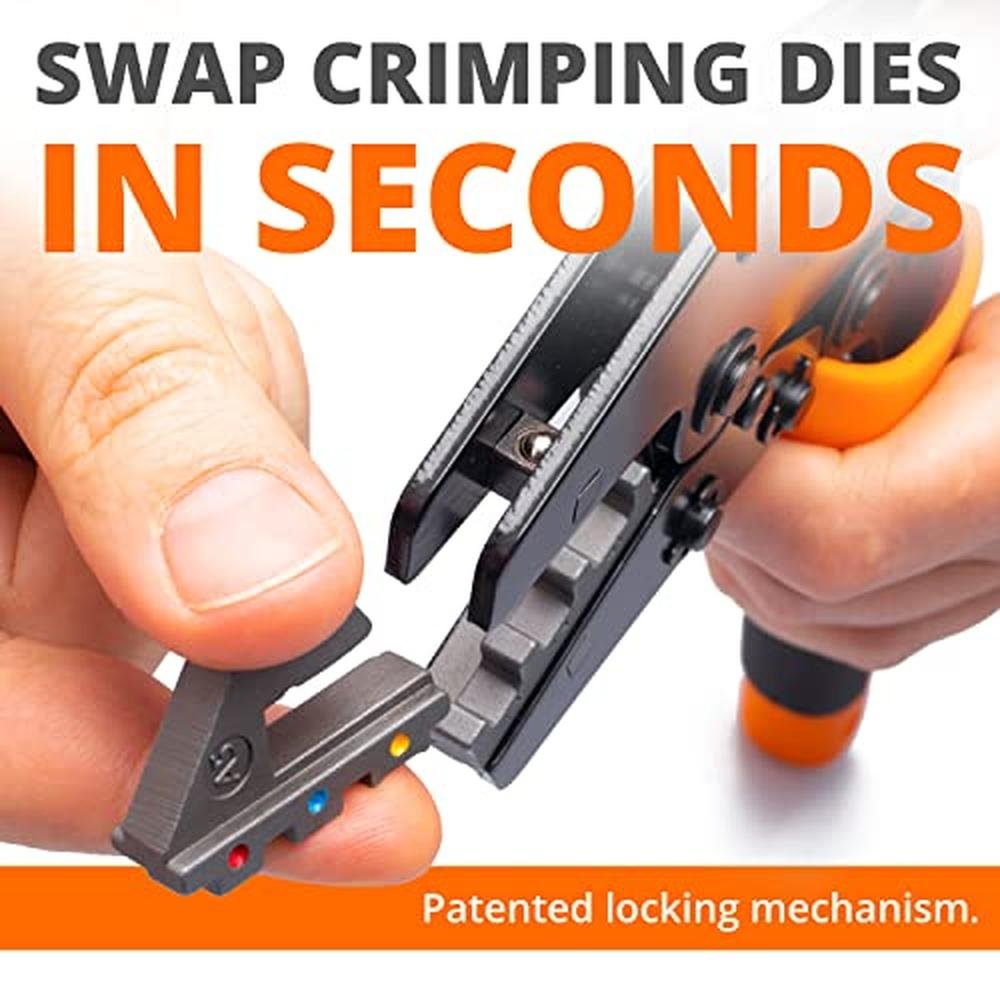 - CHANGE CRIMPING DIES IN SECONDS - Patented magnetic locking mechanism allows to swap crimping dies in seconds.
