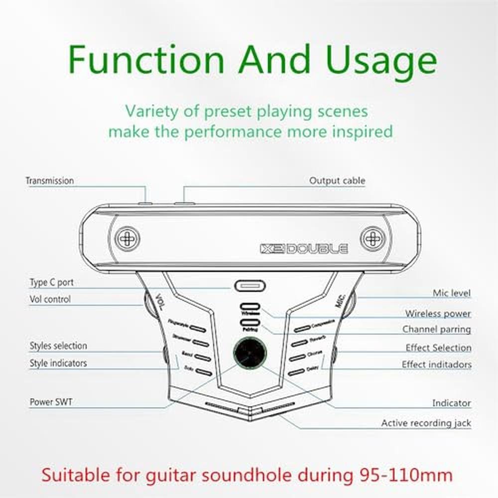 - Wireless Resonance Acoustic Guitar Pickup---Creative acoustic guitar pickup including a main equipment and receiver,Vibration System enhance guitar timbre,APP Digital intelligent adjustment of multiple effects,built-in rechargeable battery multiple guitar effects and style pattern