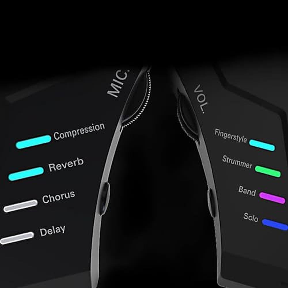 - Styles and Effects---Four play styles selection include Fingerstyle,Strummer,Band,Solo.Four effects selection include Compression,Reverb,Chours,Delay.This pickup can be stack different effects(Chours and Delay can't be use in the same time)