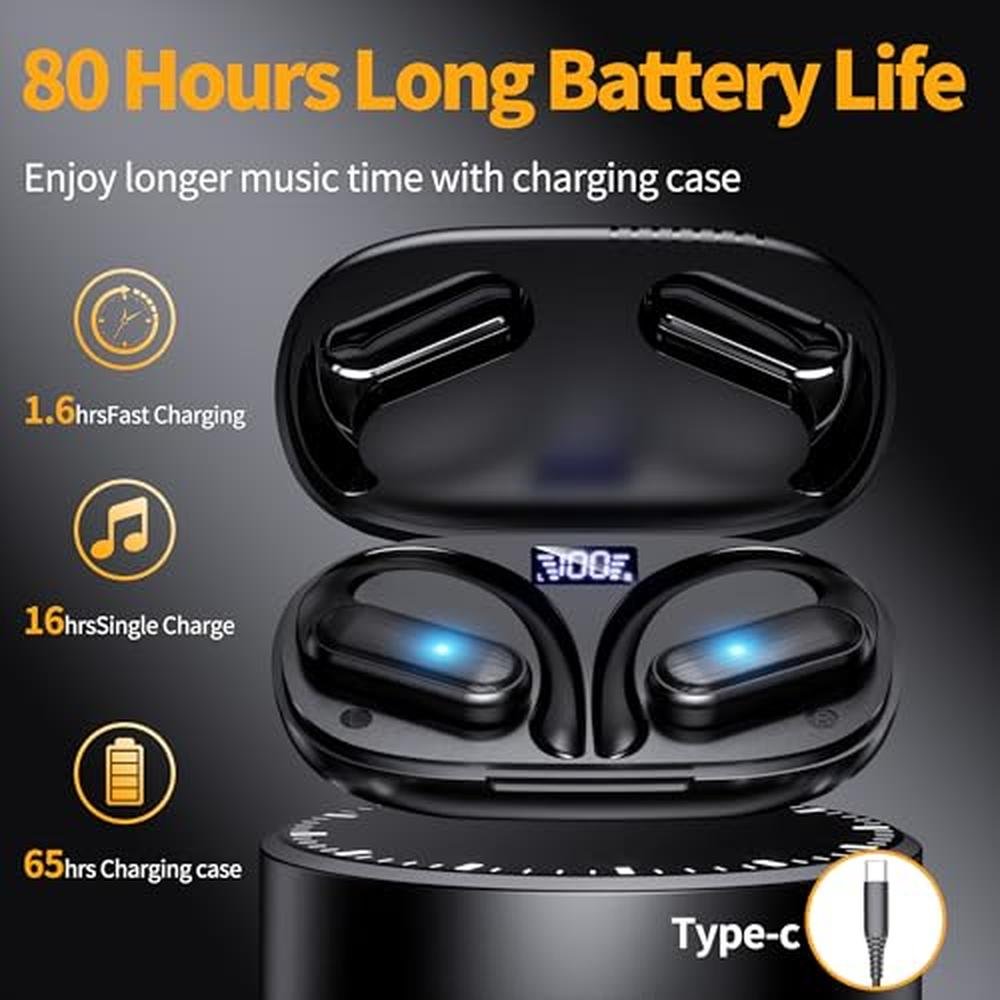 Wireless Earbuds Bluetooth Headphones 80hrs Play Back Sport Earphones with LED Display Over-Ear Buds with Earhooks Built-in Mic IPX7 Waterproof Headset for Workout Grey-Black