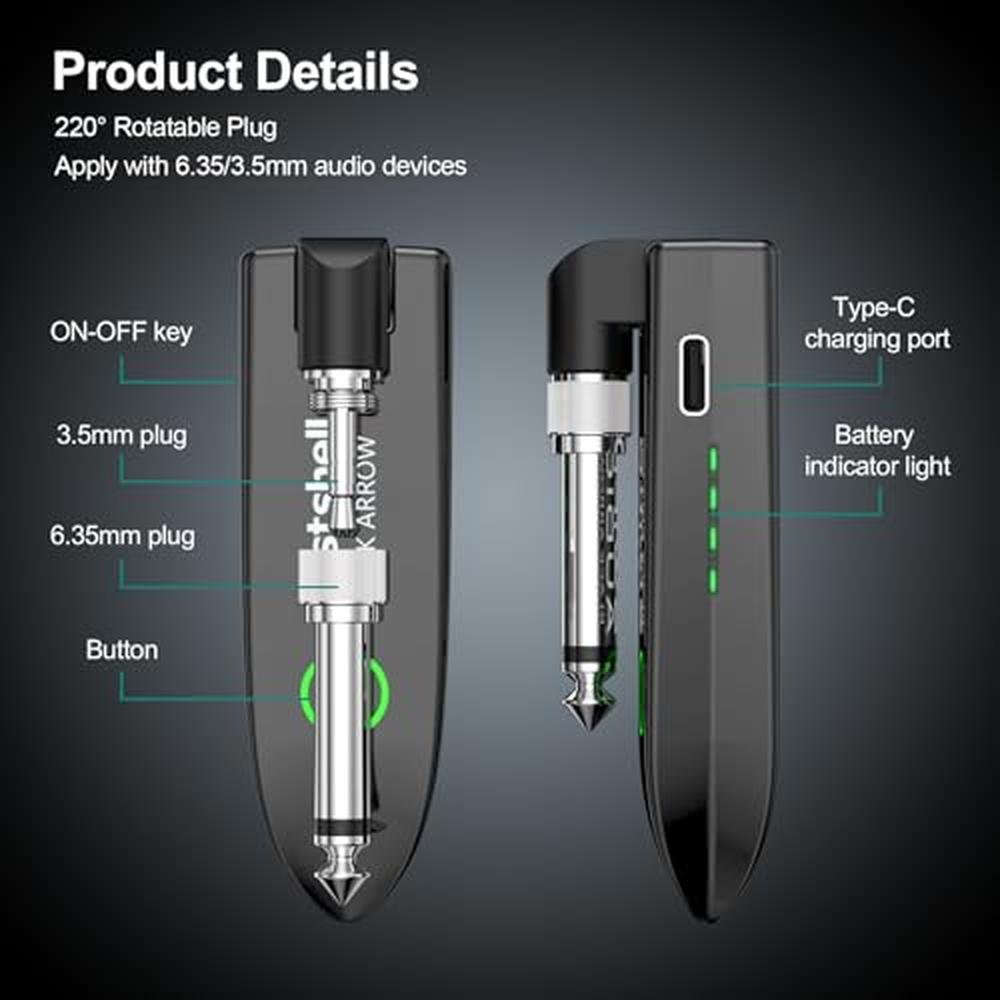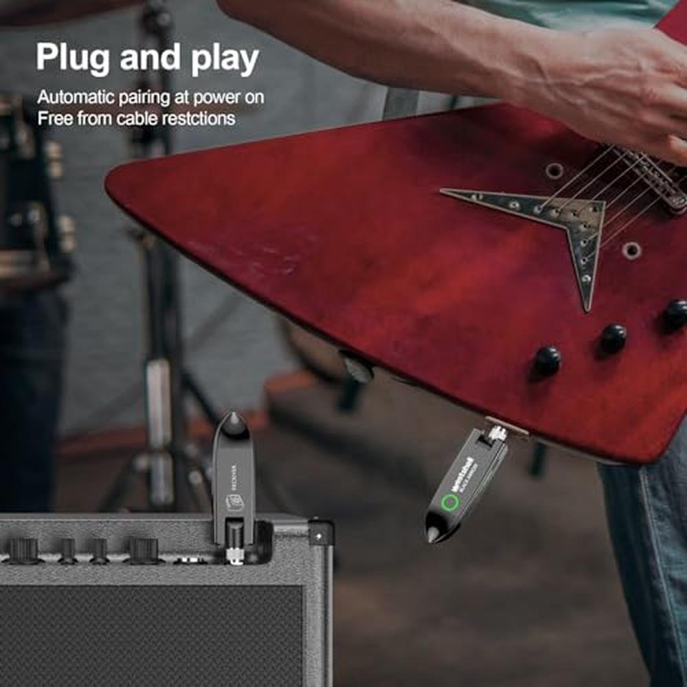 - Plug and Play: Our wireless guitar system is very easy to use, just like using your wires. Insert wireless guitar system into the instrument you want to insert. Turn them on, they will start working , no more operations are required. The guitar transmitter receiver will automatically match. Professional wireless system, suitable for most electric guitars, basses and other musical instruments with pickups and guitar amplifiers. It will ensures good performance for your every show.