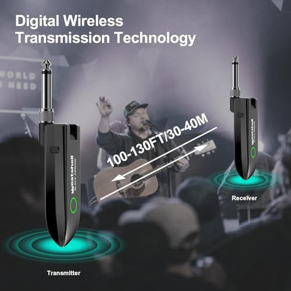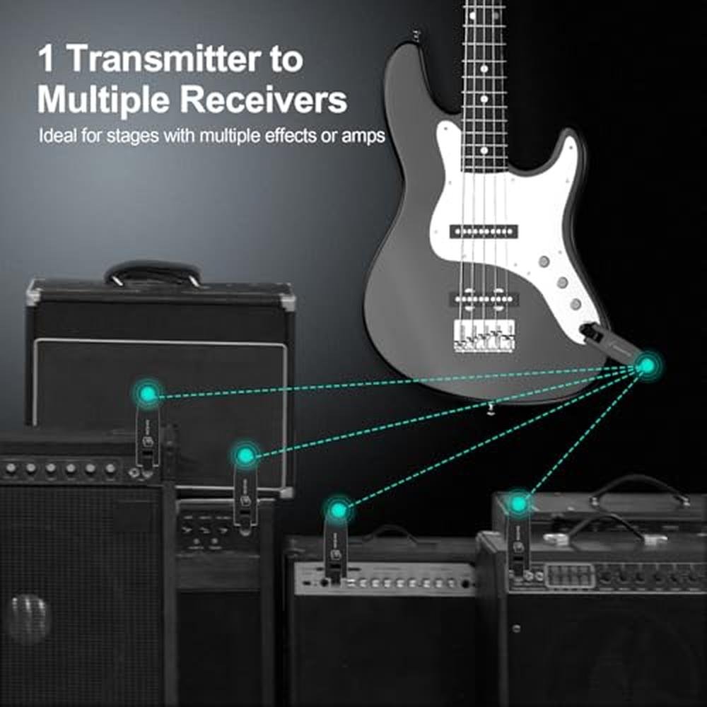 - Low Latency & No-interference: Our wireless guitar system will be better than 2.4Ghz wireless system in terms of delay and signal stability, providing excellent sound quality and stability Signal, less than 5ms latency, no-interference, no lag or signal loss, and the effective range is about 100-130ft.