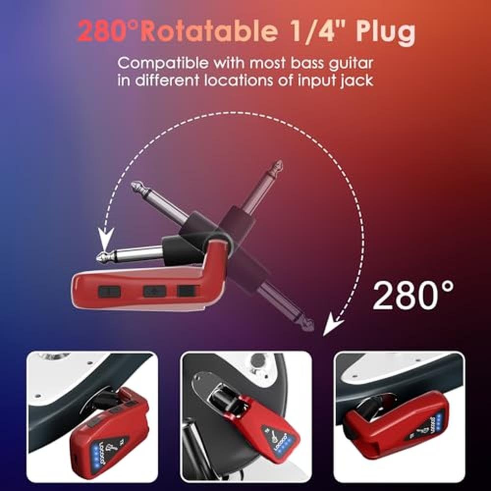 Wireless Guitar System Transmitter Receiver: UHF Cordless 164 Feet Range - 6 Channels USB-C Rechargeable Audio, 220 Rotatable Plug Design for Guitar Bass and Electric Instruments(Red)
