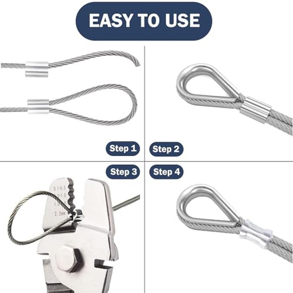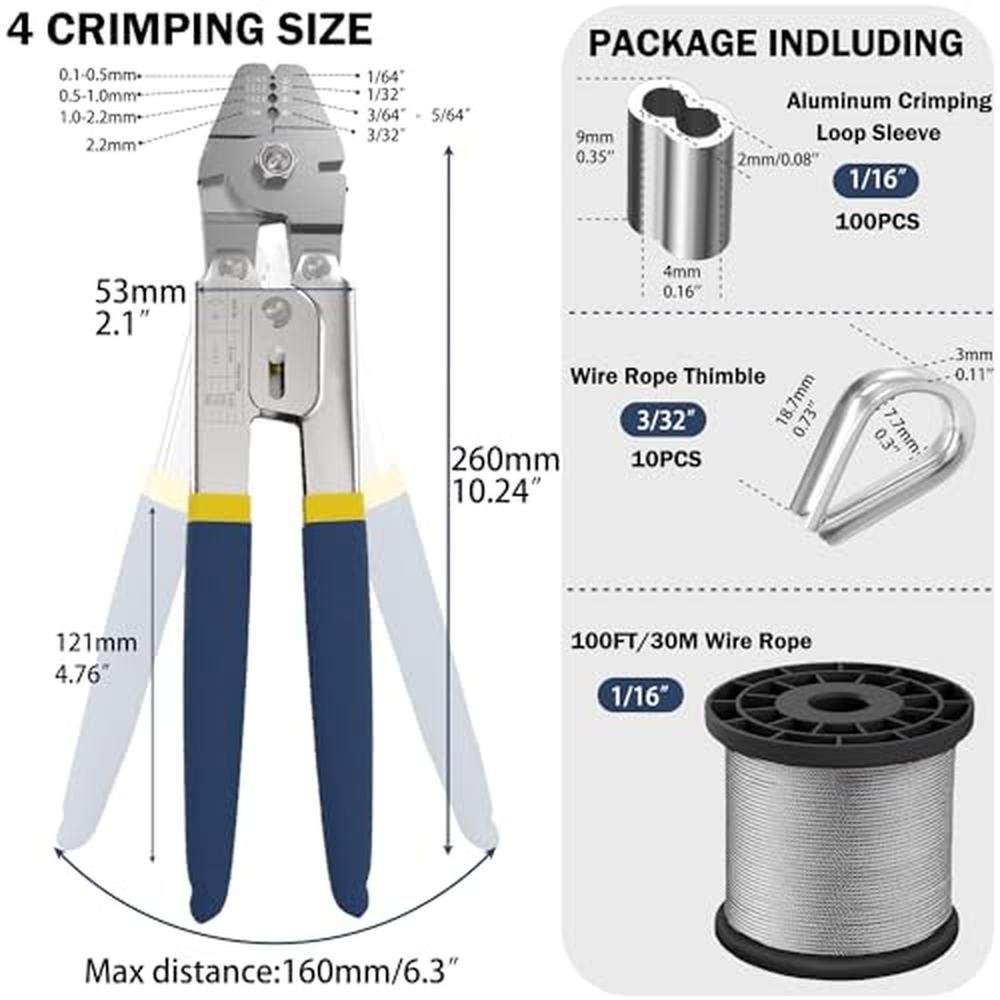 - Packing Listing- Wire rope crimping tool kit includes 1pcs heavy duty Crimping Plier, 100FT 1/16" Wire Rope , 100pcs Aluminum Crimping Sleeves Loop and 10pcs Stainless Steel Wire Rope thimbles.