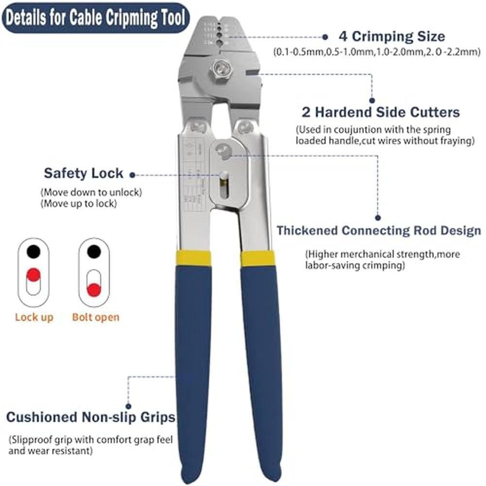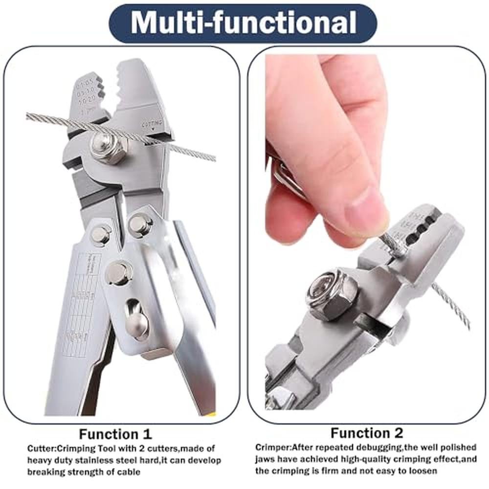 - Wire Rope Crimper&Wire Cable Cutter- Crafted from Premium Stainless Steel,ensures longevity and reliability in every use.Achieve accurate crimps with 4 adjustable positions ranging from 0.1-2.2mm, providing versatility for various wire rope sizes.It features non-slip grips and a self-locking mechanism for enhanced safety and ease of operation.