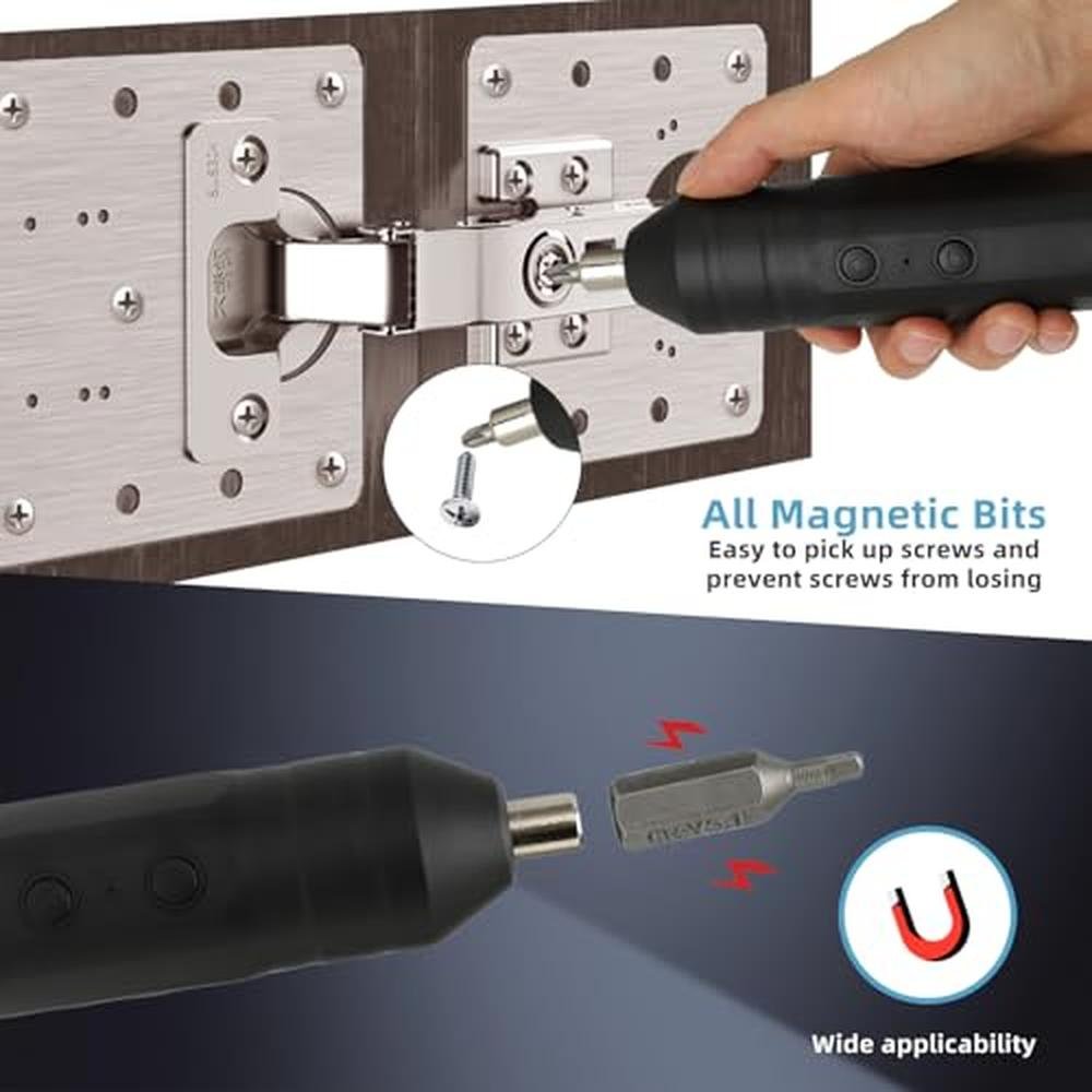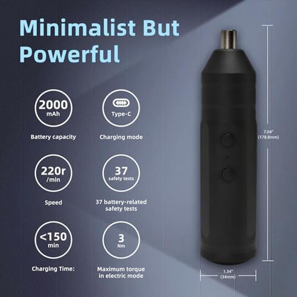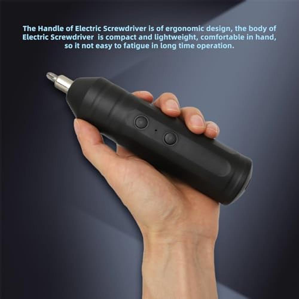 1. Accurate Torsion Control: The mini electric screwdriver set offers accurate torsion control, automatically stopping the motor when the locking screw reaches the preset torsion value. This feature prevents overtightening or stripping of screws, ensuring secure and accurate fastening without slippage. 2. Audible Torsion Confirmation: With the slip clutch mechanism in place, users receive audible feedback in the form of a distinct slipping sound when the set torsion value is reached. This tactile and auditory indicator helps users easily identify when to release the switch, enhancing the overall fastening experience. 3. Comfortable And Ergonomic Handling: The portable electric screwdriver kit is designed with a user friendly handle that is compact, lightweight, and ergonomically shaped for comfortable and extended use. The ergonomic design reduces hand fatigue, making it ideal for prolonged working sessions. 4. Enhanced Stability And Accuracy: The electric screwdriver's high concentricity and stable performance are attributed to its planetary alloy gear structure. This design ensures minimal rotation amplitude, fluent operating, and consistent results, making it suitable for tasks requiring high accuracy. 5. Convenient Reversing Function: The one button forward and reverse rotation feature allows for seamless switching between directions with ease. This intuitive design enables users to quickly switch between driving and removing screws, improving efficiency and productivity during various fastening applications. Specification: Item Type: Electric Screwdriver Set Material: ABS, Metal Working Voltage: 3.7-4.2V Speed: 320r/min Torsion: 3N.M Charging Time: Battery Type: 4.2V Lithium Battery (Included) Battery Capacity: 2000mAh Package List: 1 x Screwdriver 32 x Short Bits 10 x Long Bits 1 x Extension Rod 1 x Charging