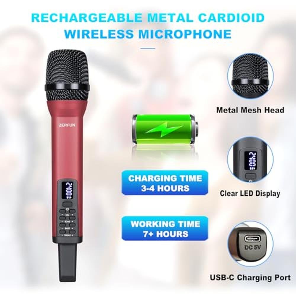 • RECHARGEABLE WIRELESS MICROPHONE: ZERFUN Rechargeable Wireless Microphone with independent Volume, ECHO, Treble, BASS Control. Perfect for home karaoke, meeting, party, church, DJ, wedding, and much more. They are well-made cardioid wireless mics which means they pick up noise unidirectionally (Only when we speak towards the top of the microphone will there be a sound, while there will be no sound when speaking on the side). With this pickup pattern, the directional vocals are easy to isolate from background noise.