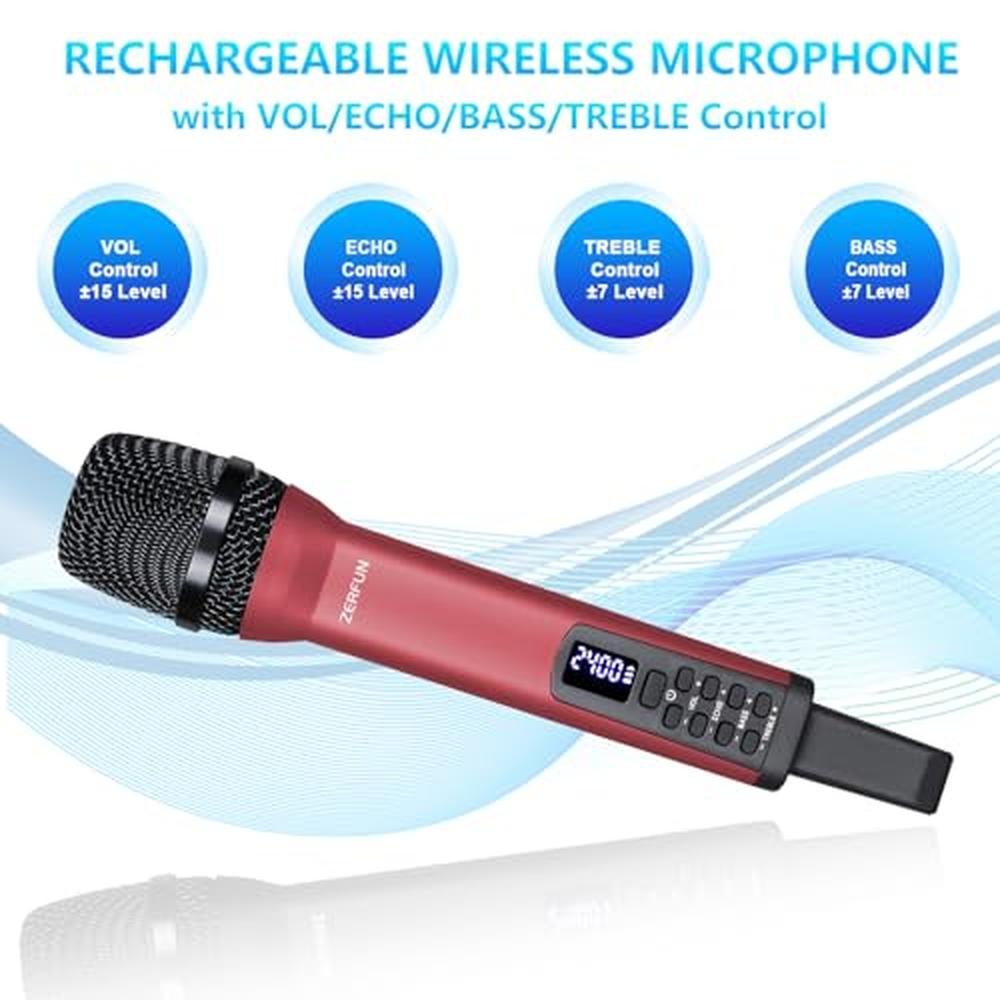 ZERFUN Rechargeable Wireless Microphone, Pro Handheld Cordless Mics System Dynamic with ECHO Treble BASS VOL Control for Karaoke Singing Church Party, 1/4'' Output, D240, Red.