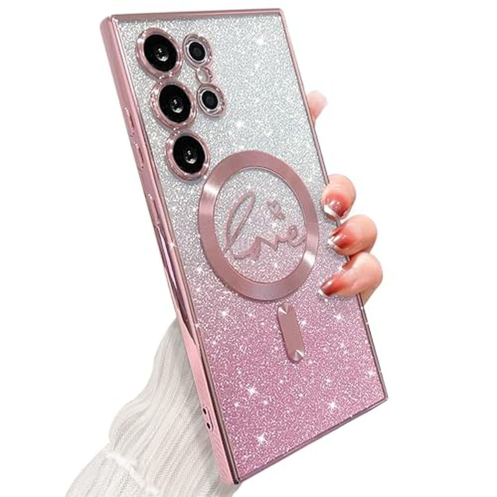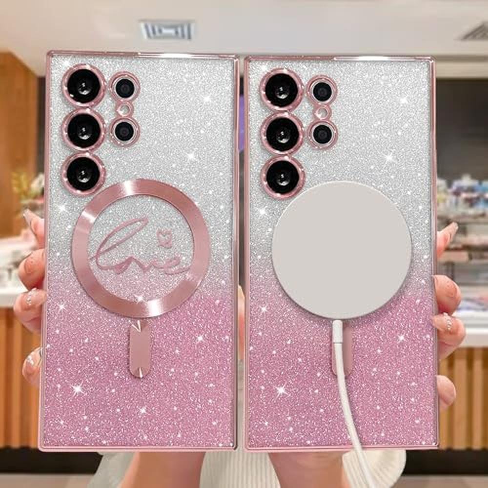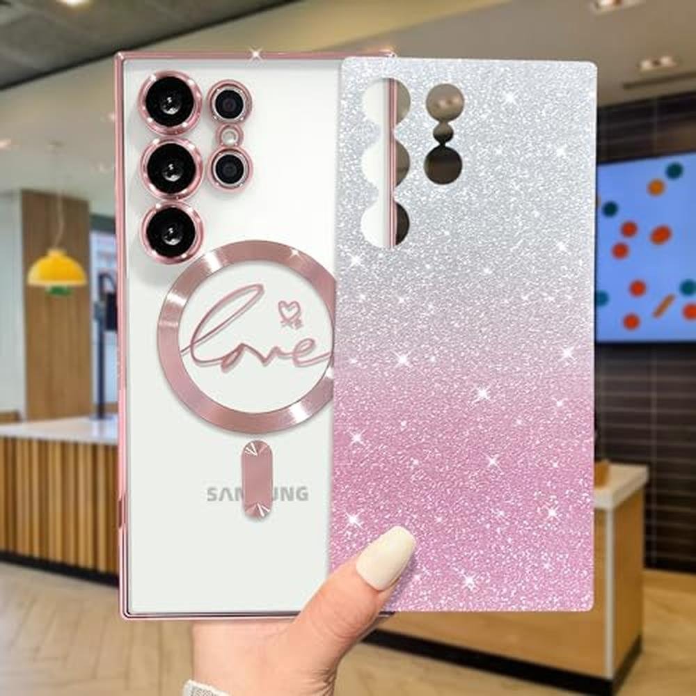 ZONRW for Samsung Galaxy S24 Ultra Case Magnetic,for Women Girl Soft Cute Luxury Love Heart Plating Bling Gradient Glitter Clear Phone Case Compatible with MagSafe Shockproof Back Cover, Pink
