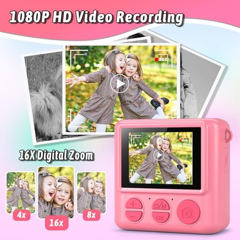 - Multifunctional Kids Digital Camera This mini camera with instant print,2.4 inch large screen,1080P video,16X the digital zoom,flash,time -lapse,continuous shooting,games,filters frame,mp3.This can meet the different needs of children. It is a good choice to accompany children to grow up happily.Bring a wonderful moment to you and your family