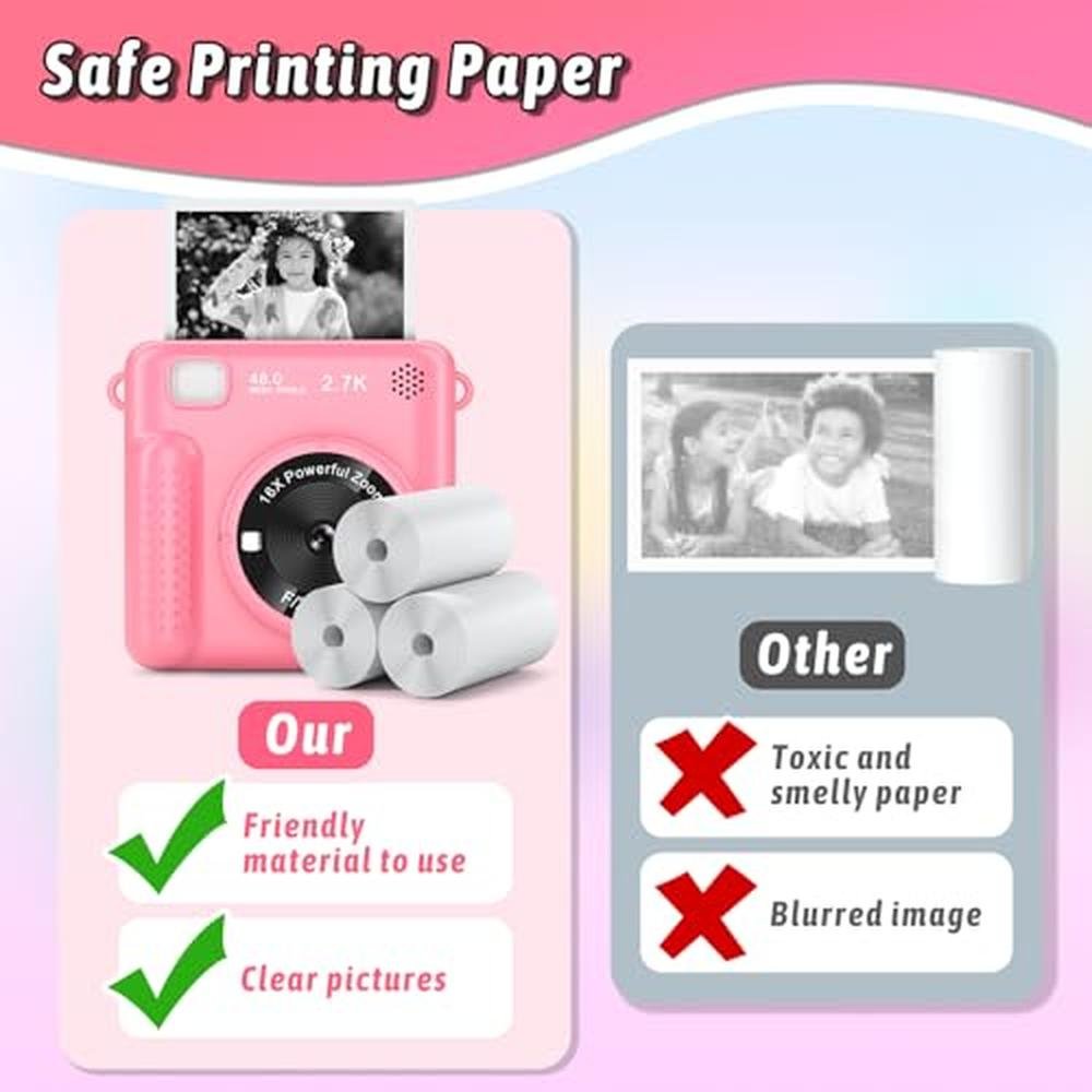Instant Print Camera for Kids Record the beauty of life in a more interesting way We are committed to bringing a happy childhood to all kids.Protect your child's growth and enjoy taking photos and DIY photos in a non-toxic environment.This printed camera toy is more educational and interactive, photography, painting, music, video, games are children's favorite entertainment, we put them together to stimulate children's desire and interest in photography. It can be a big surprise as a birthday gift, Christmas gift and a Childrens'Day gift.
