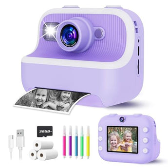Perfect Gift for Kids Ages 3-12 - kids instant print camera Do you want a special gift for your child? Bring fun and convenience to children, our kids camera will be your choices. That's great entertaining toys for girls age 6-8 Children can take many fun photos with their friends,and than printing it right nowUpgraded to dual-camera configuration, easy to take selfies. Can connect to a computer and upload and download pictures, music(MP3 format). Features: Dual Camras, 1080P Video, 8X Digital Zoom, 5 Games, Flash, Playback, Music Player,32 GB SD card, five country language, ringtone volume, etc Specification: Screen size: 2.4-inch screen Recharge type : Typ-C USB cable Battery: 1500MHA(Over 3.5 hours standby) What is in box 1*Kids Didital Camera 1* Type-C UBS cable 1*User Guide 1*32GB SD CardColor Pen1*Lanyar 3 Rolls of Printing Paper