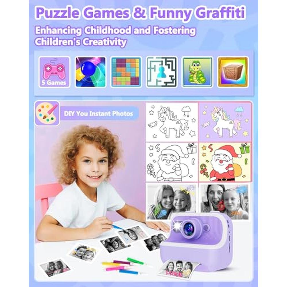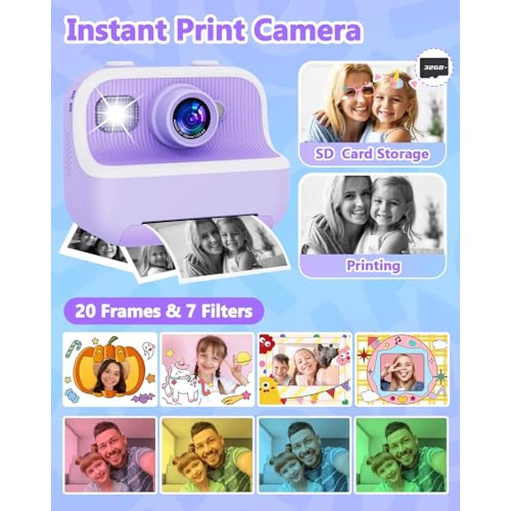 Instant Print Camera for Kids, Christmas Birthday Gifts for Girls Boys, Kids Camera Instant Print with Dual Cameras 1080P Digital Camera Toys for 4 5 6 7 8 9 10 Year Old Girl with 32GB SD Card-Purple