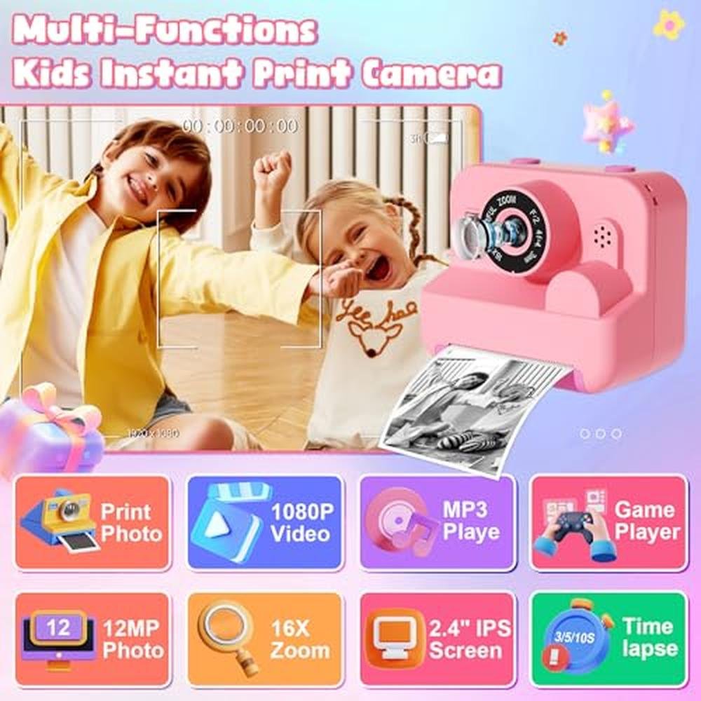 - Multi-functional kids instant print camera - Educational and fun: This kids video camera has 2.4-inch screen, 1080P HD video, 16x digital zoom, flash, time-lapse, continuous shooting, games, filters, photo frame, MP3, multiple functions to meet the different needs of children. It is a good choice to accompany your child to grow up happily. Diy instant digital camera with these features can inspire children's desire and interest in photography.