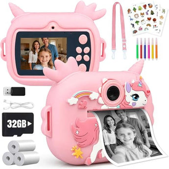 - Instant Print Camera for Kids: This kids instant print camera uses safe, non-toxic materials and ink-free thermal printing technology to deliver black & white photos in seconds. This girl toys comes with colored pens for added DIY fun, and color photos are automatically saved to an SD card for later digital viewing.