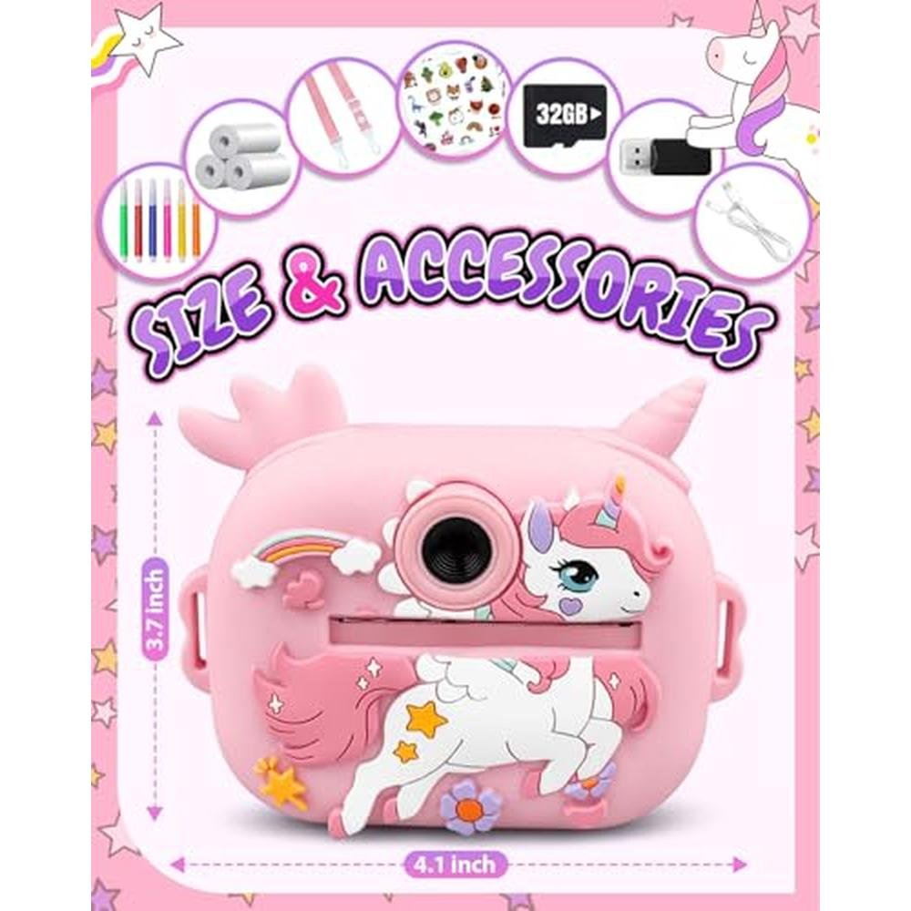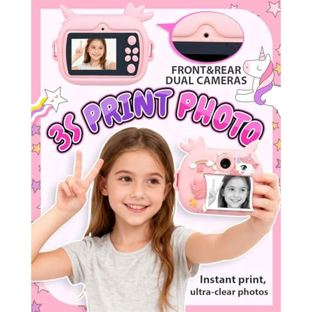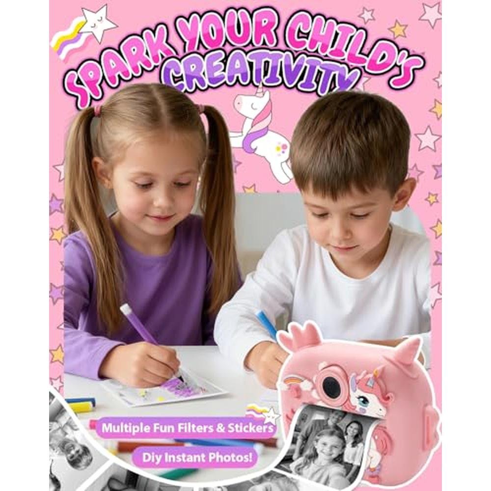 Compact kids camera instant print with 2.4" HD screen and auto focus. This digital camera for kids features fun filters, 21 stickers, 4 games, and a durable silicone case. Perfect instant print camera for kids ages 3+.