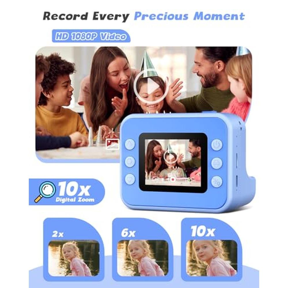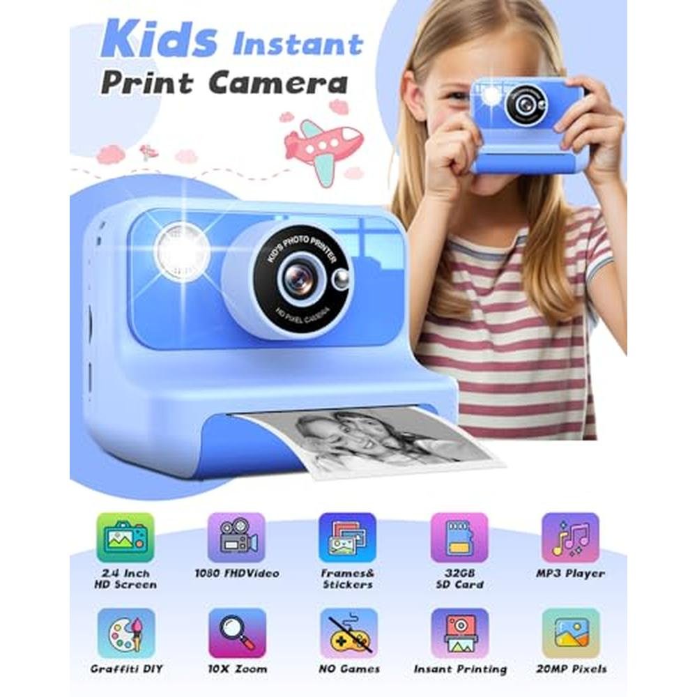 - 1080P Video, 20MP Photos & Instant Sharing FunWith 1080HD video resolution and 20MP photos, this print camera allows kids to capture vibrant moments with stunning clarity. Thanks to the instant print feature, children can immediately share their photos with friends and family, turning every snapshot into a fun and interactive experience. Equipped with a 32GB SD card and 3 rolls of thermal print paper, it's perfect for capturing and sharing memories on the go