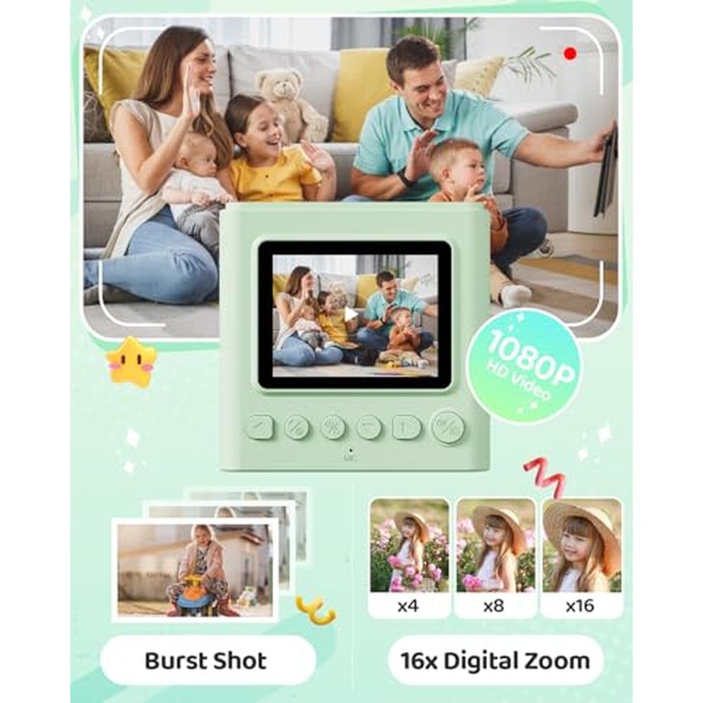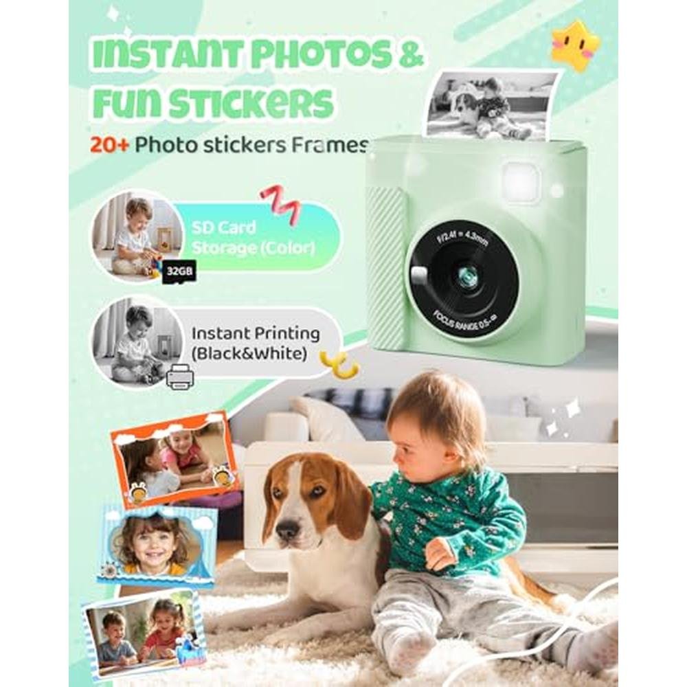 VERSATILEPRINT CAMERA: Our kids print camera is packed with features such asphotography, video recording, black-and-white printing, fun frames, music,games, a flashlight, and more. It caters to the diverse entertainment needs ofchildren and guarantees endless fun. CLEAR PICTURE QUALITY: This kids digital camera features a 12MP lens that delivers clear imagequality. The 2.4-inch screen offers a vibrant color display for your child. Italso supports 1080P HD video recording, continuous shooting, timer shooting, and16x zoom to capture precious memories for your toddlers. WORRY-FREE USE: Thisinstant camera operates without the need for ink or toner, delivering clearblack and white photos with just one click. It's a safer choice for kids. Plus,it includes five colorful pens so children can personalize their photos, sparkingtheir imagination and creativity. EXTENDED BATTERY LIFE: Our instantprint camera for kids features a robust 1300mAh battery, offering up to 4hours of continuous use on a single charge. With an included 32GB memory card,there's ample space to store a multitude of photos and videos. You can effortlesslytransfer files to your computer using the provided USB charging cable or cardreader, ensuring your privacy is always protected. PERFECT GIFT FOR CHILDREN: This toy camera isn't merely a toy; it's a doorway to boundless creativityand joy. Ideal for Christmas, New Year, holidays, birthdays, family gatherings,and other special occasions, this instant print camera will charm boys andgirls aged 3 to 12.