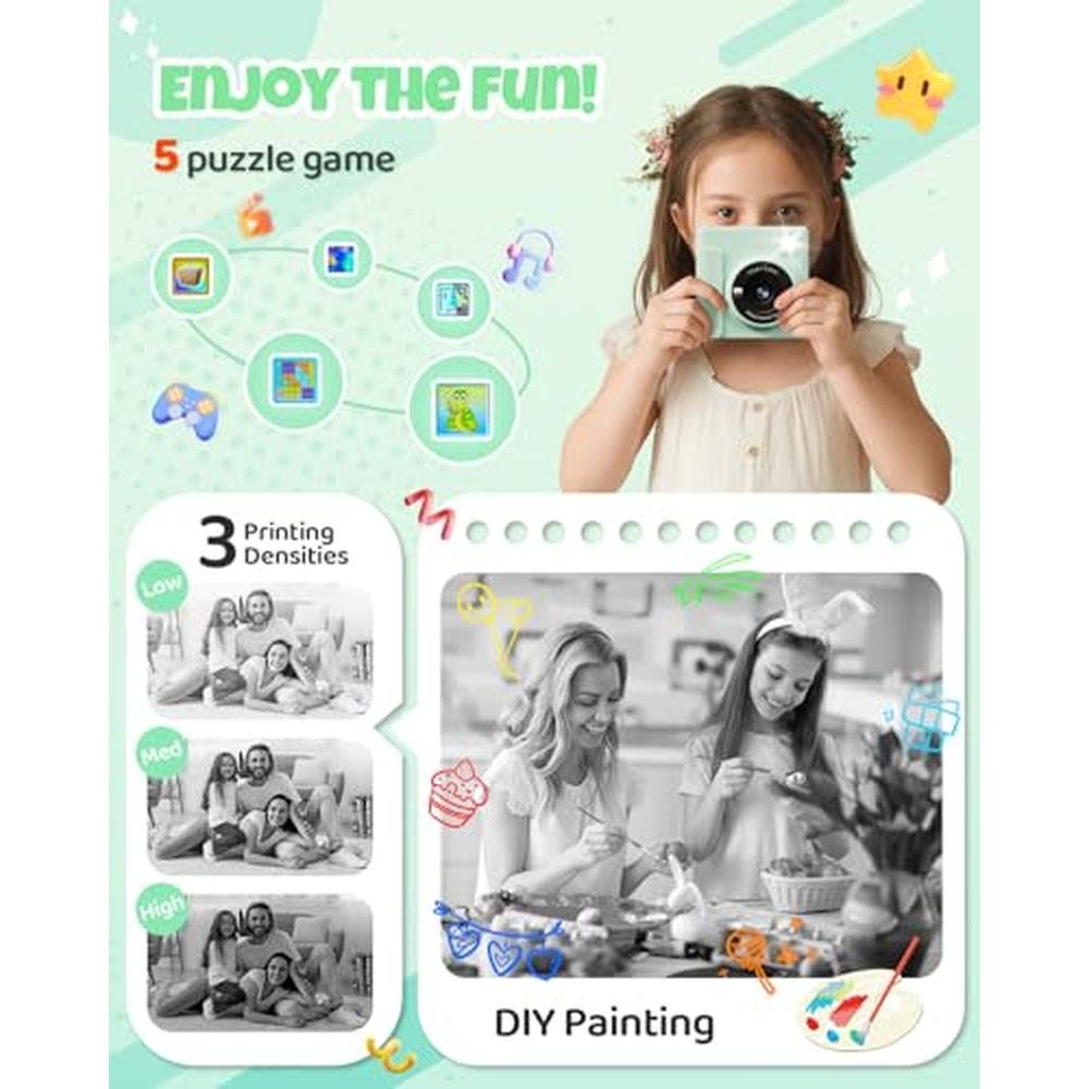 - VERSATILEPRINT CAMERA: Our kids print camera is packed with features such asphotography, video recording, black-and-white printing, fun frames, music,games, a flashlight, and more. It caters to the diverse entertainment needs ofchildren and guarantees endless fun.