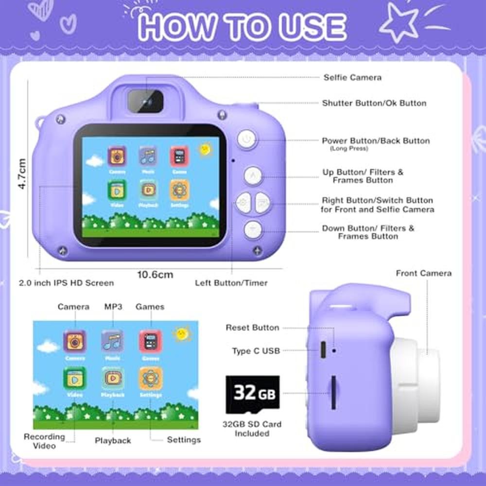 - TYPE-C & SD CARD SLOT: This kid camera features a Type-C USB rechargeable port for easy charging via PC or external power supply. It comes with a 32GB SD card included, perfect for storing fun moments. Ideal for girls birthday gifts and gifts for 5 year old girls, ensuring hours of photo-taking fun.