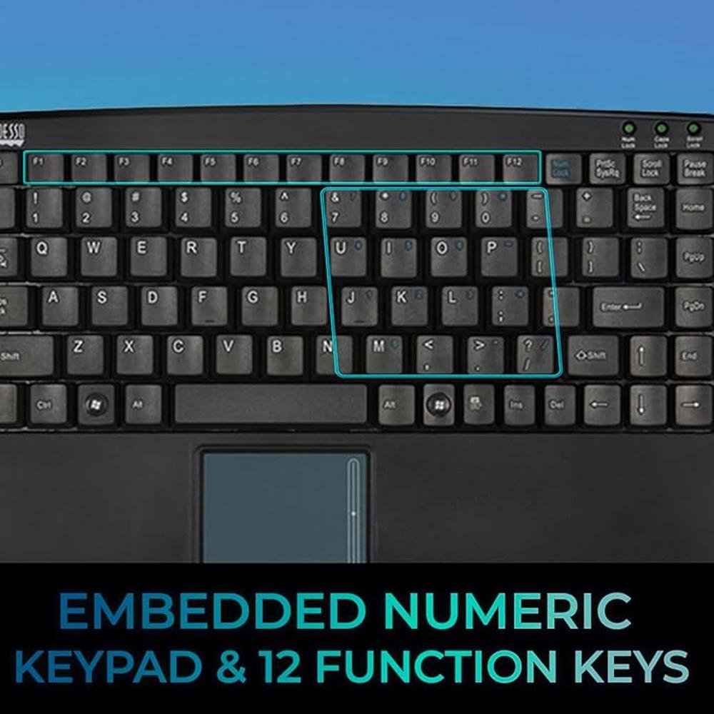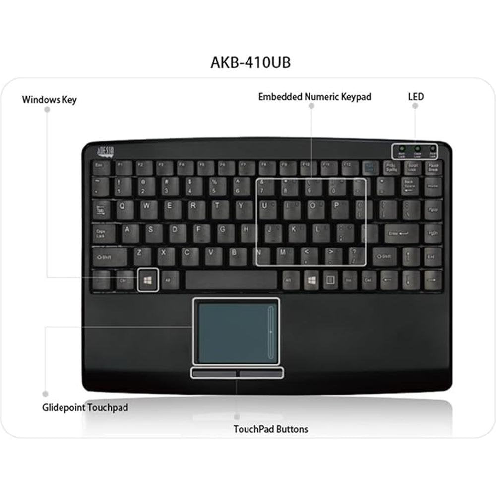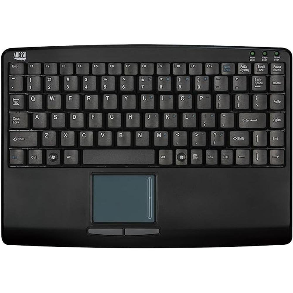 The Adesso Slim Touch Mini Keyboard combines the control of an integrated touchpad with the features of a standard keyboard to provide a small, yet powerful input device. The touchpad includes a scrolling area that scrolls up and down for faster browsing and it can be upgraded to a 4-way scroll with the GlidePoint 3.3 driver. The Adesso SlimTouch Mini Keyboard is perfect and ideal for slim line PCs, notebooks, POS stations, kiosks, and wherever there is little space, making it suitable for use in environments where several keyboards are in use at the same time. Compatible with Windows 7, Vista, XP, or 2000, this keyboard offers a versatile and high-performance input solution.