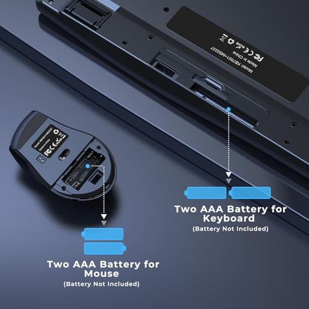 The keyboard with a built-in palm rest, and also has little kickstands to create a slight tilt allowing your wrists to rest comfortably while typing, combined with a ergonomic wireless mouse, allows you to work comfortably for all days! Low Power Consumption 2 AAA batteries required for the keyboard, and 2 AAA batteries required for the mouse(BATTERY NOT INCLUDED). The ergonomic keyboard mouse will fall into sleep mode after 5 minutes without action, There is an ON/OFF button on both of the wireless mouse and keyboard, so you can turn them off when you are finished using it for energy saving.