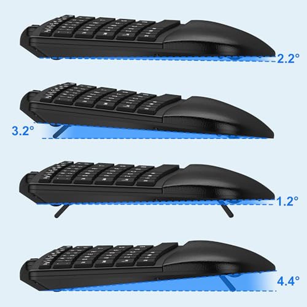 • Ergonomic Design Wireless KeyboardThe Quasio wireless keyboard is designed with ergonomics, featuring a curved palm rest with soft foam padding, a wavy surface, and a split-key layout. At the bottom of the keyboard, there are four foldable stands and three anti-slip rubber pads that allow for keyboard height adjustment. Every detail is tailored to provide you with a more comfortable typing experience, avoid wrist fatigue.