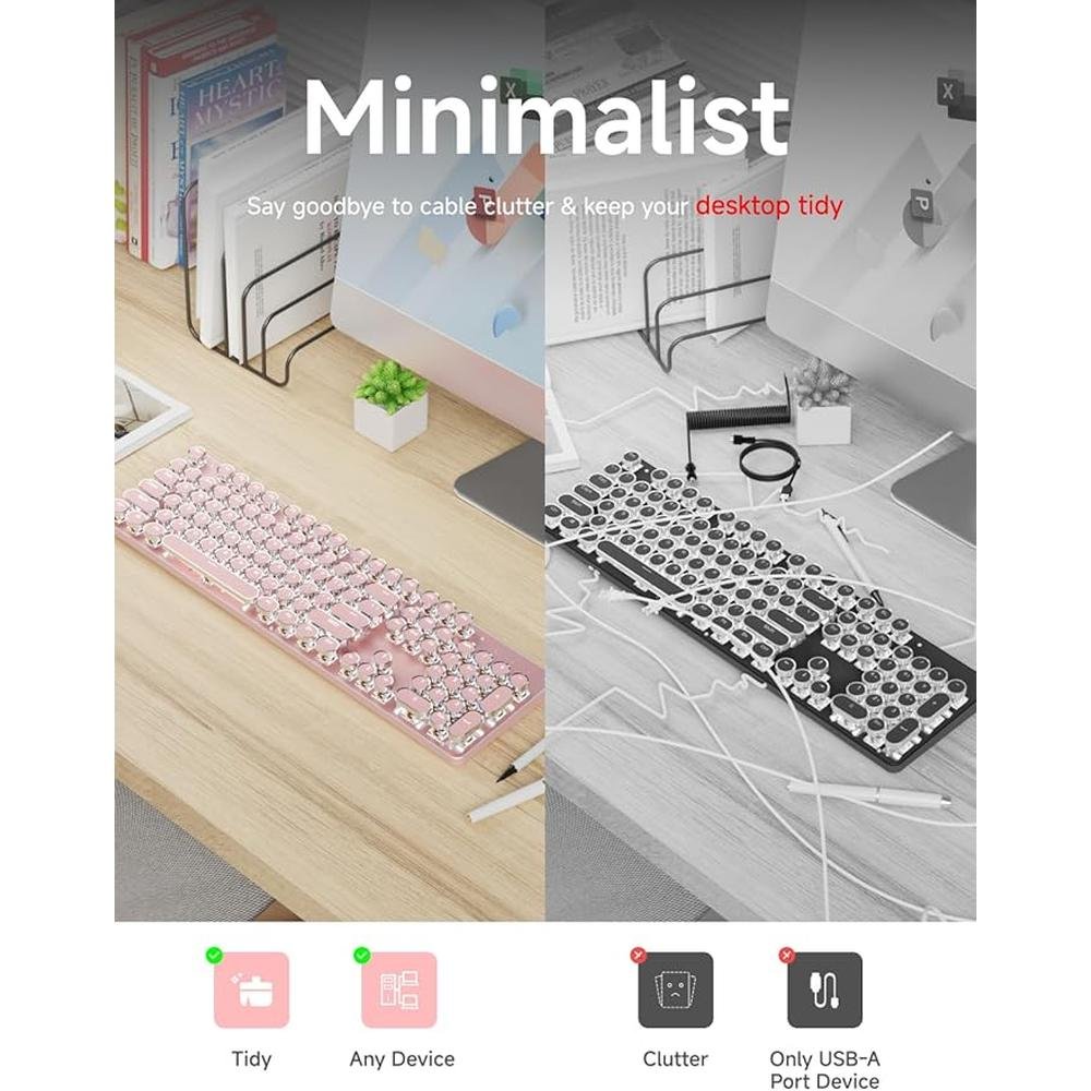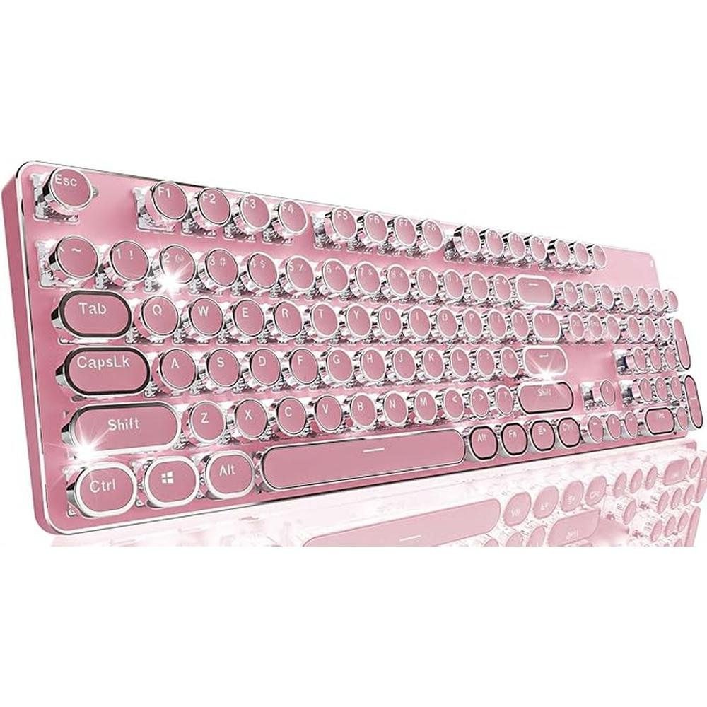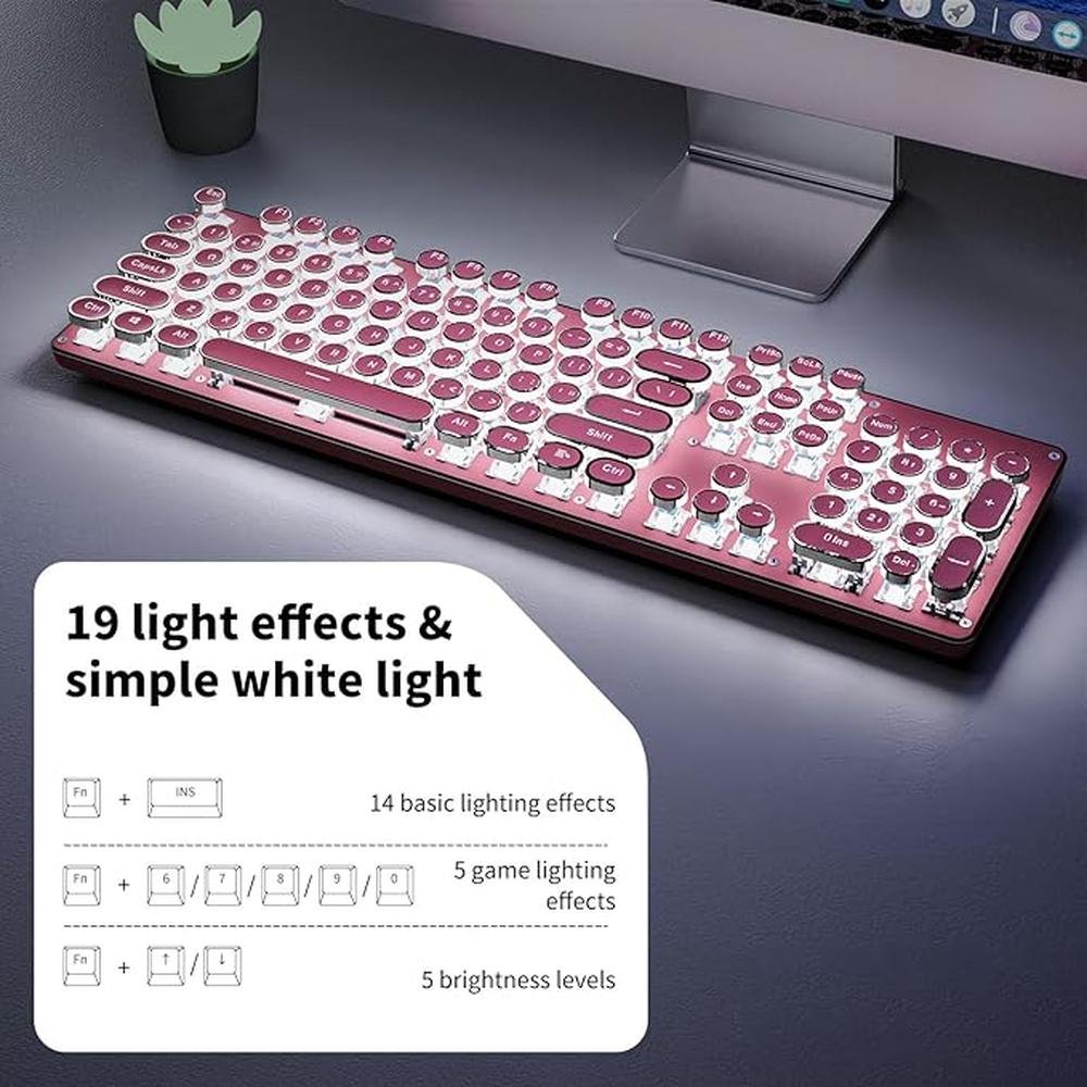 - Typewriter keyboard with 104 keys and white backlit for enhanced visibility and aesthetic appeal