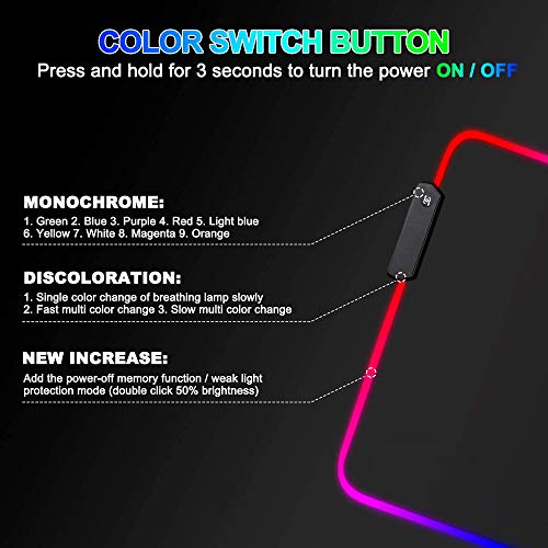 Our large LED gaming mouse mat is designed for gamers and office workers alike, made of high-quality rubber and featuring 15 RGB lighting modes, including Red, Green, Blue, Purple, Indigo, Yellow, White, Magenta, Orange, Alternating Wave, Synchronizing Wave, Alternating Flash, Alternating Red Changing, Synchronize Breathing, and Alternate Breathing. The Power-off memory mode and lights off feature provide visually stunning colors and effects. With dimensions of 31.5 x 12 x 0.12 inches, this mat supports full-sized keyboards with more than enough room for your mouse. The low friction smooth surface ensures speed and control, while the anti-slip rubber base keeps your mat in place. Portable and optimized for various mouse sensors and sensitivities, this mat is the perfect addition to your gaming setup.