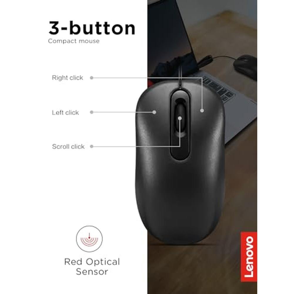 Experience unparalleled precision and comfort with the Lenovo 100 Wired USB Computer Mouse, designed to elevate your computing experience on Windows-based PCs, laptops, and computers. This full-size, ambidextrous mouse boasts a 3-button design and is equipped with a high-precision red optical sensor for seamless navigation. Engineered for reliability and efficiency, this mouse is perfect for users seeking a premium input device. With its durable construction and sleek black finish, this mouse is built to last and enhance your productivity. Whether you're working on a Lenovo ThinkPad, Lenovo laptop, or Lenovo desktop, this mouse is a great addition to your computing setup.
