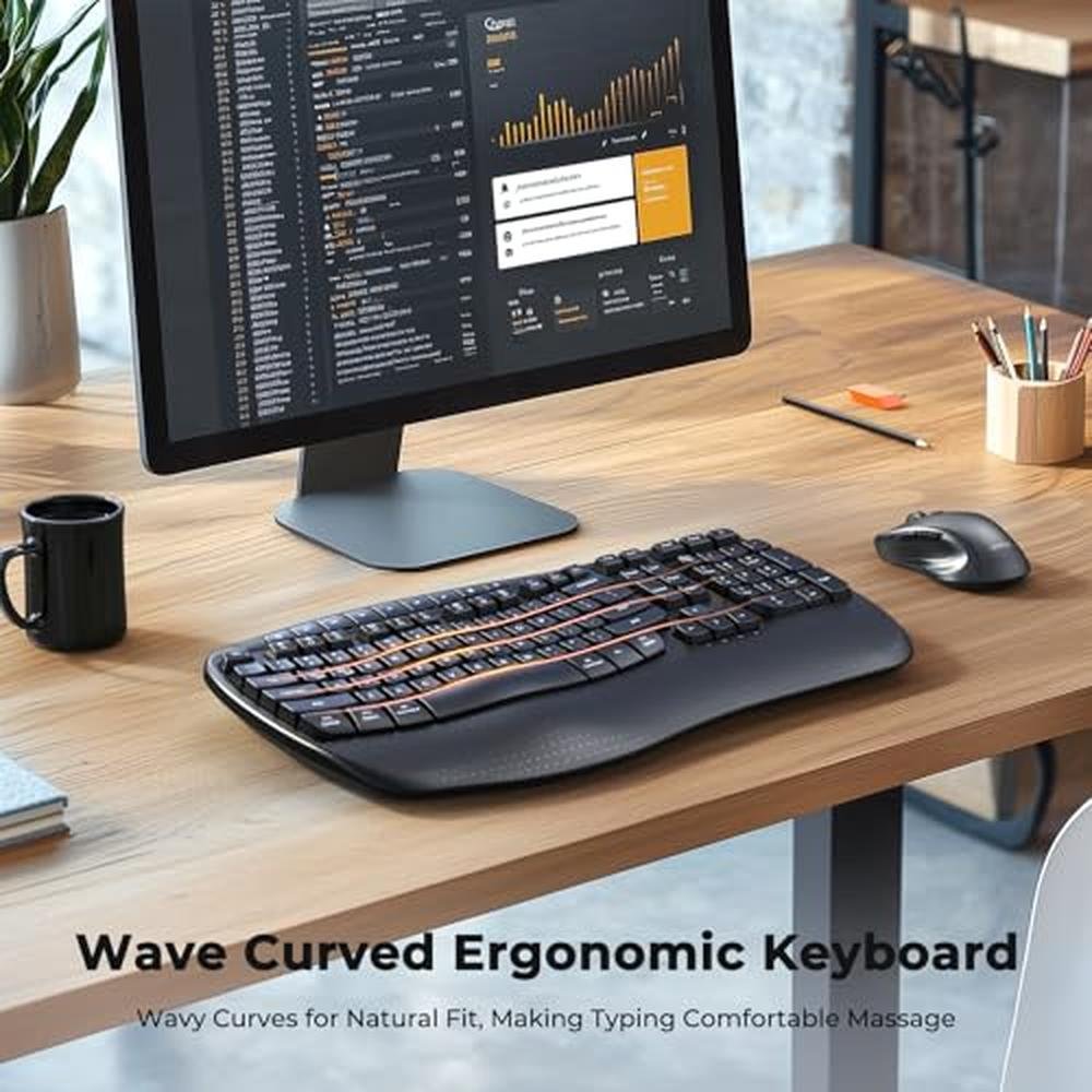 Featuring wave-shaped keys tailored to the varying lengths of your fingers, this keyboard enhances comfort and promotes efficiency during typing, ensuring optimal support for your hands, wrists, and forearms during prolonged work sessions.