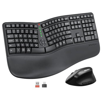 Experience the ultimate in comfort and productivity with the MEETION Ergonomic Wireless Keyboard and Mouse combo, designed to provide a natural typing experience. As a top-rated keyboard mouse set, this ergonomic solution features a split curved keyboard with a built-in wrist rest, reducing strain on your hands and wrists. The included vertical mouse promotes a neutral wrist position, alleviating discomfort and fatigue. With its rechargeable design and full-size layout, this keyboard mouse combo is perfect for Windows, Mac, computer, and laptop users. Whether you're looking for the best buy keyboard mouse or a reliable wireless keyboard mouse combo, MEETION's ergonomic wireless keyboard and mouse is the perfect tool for all your computing needs.