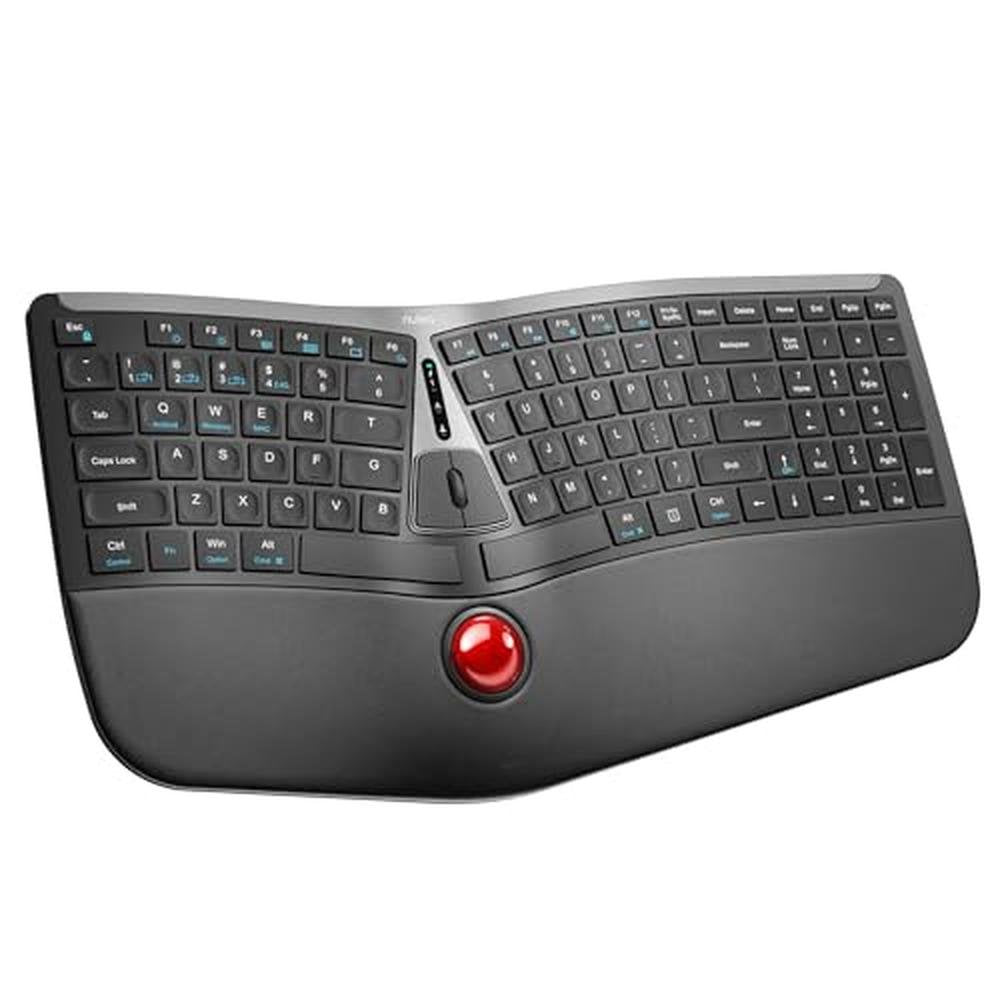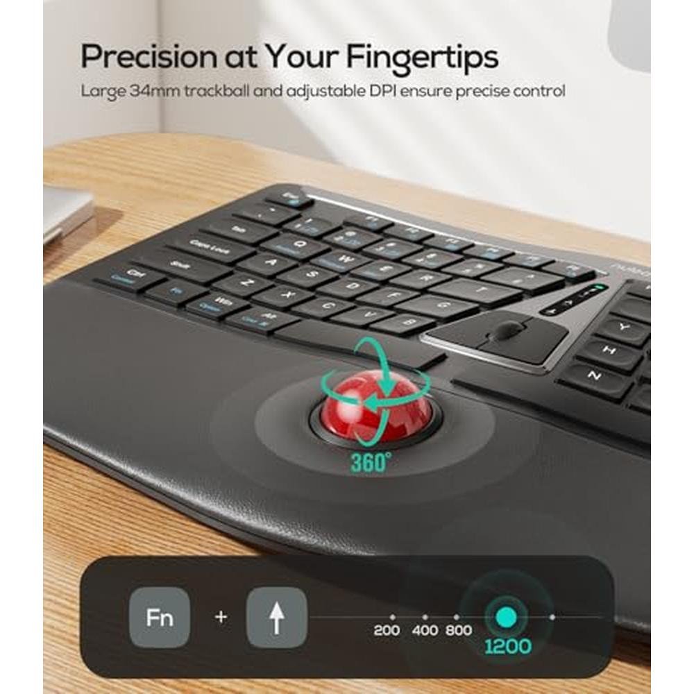 Nulea Ergonomic Trackball Keyboard. Its split design and palm rest provide ergonomic comfort to reduce forearm strain and carpal tunnel risk. Integrated trackball facilitates cursor movement. Scissor switch keys provide smooth typing experience. With dual-mode connection, it is very flexible. High quality and durable. Upgrade your workspace and enjoy comfort and efficiency.