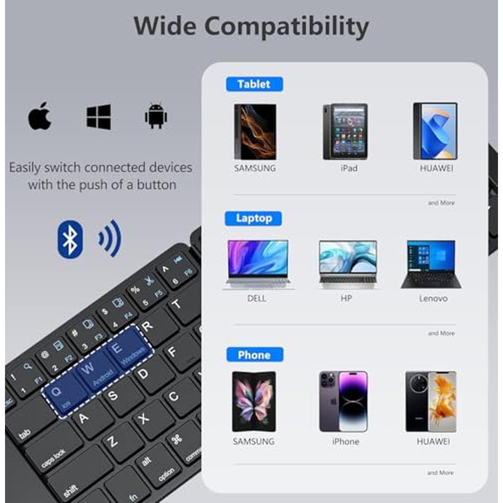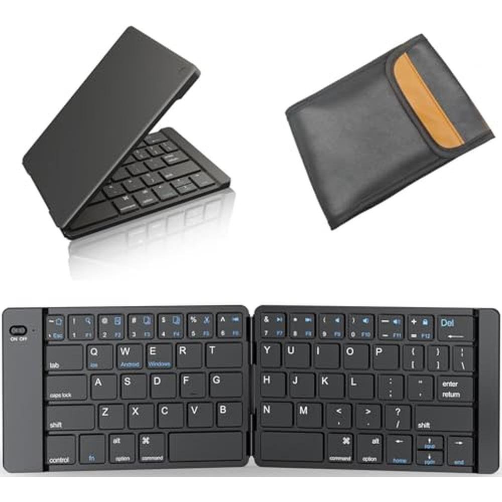 • Bluetooth Foldable KeyboardPortable folding keyboard with storage bag allows you to work anywhere, anytime! The standard size design allows accurate, fast typing, just like the desktop keyboard you are used to. Silent keys allow you to focus on your work. Perfect for travel and business trips.