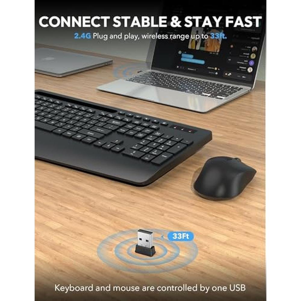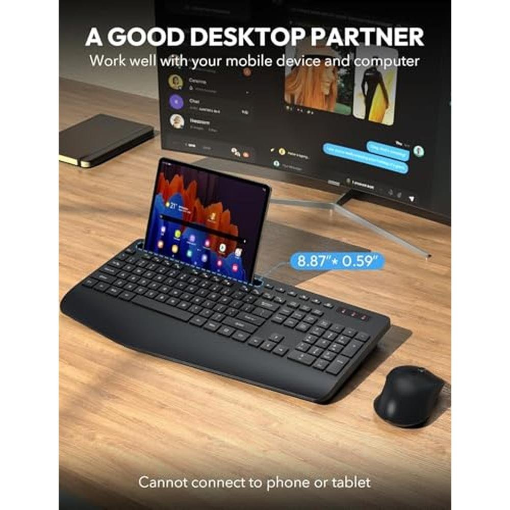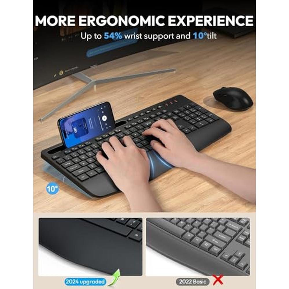 Ergonomic Design for Ultimate Comfort Wrist Rest: Our 2024 upgraded ergonomic wireless keyboard comes with a 2.8-inch wide wrist rest, providing exceptional hand support. The 10 tilt angle prevents wrist strain, making every typing session more comfortable and enjoyable. Seamless Multitasking Multitasking Holder: The full-size keyboard is equipped with a built-in holder that accommodates phones and tablets up to 11.9 inches. This feature allows you to multitask effortlessly, ensuring you never miss important notifications or updates while using our wireless keyboard and mouse combo.